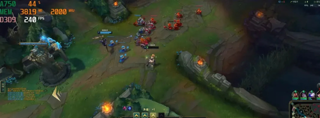 《LOL》在1080P最高画质下,团战场景的平均帧率为160FPS以上,对线期更是能突破200FPS,配合高刷新率显示器,操作手感丝滑无比;特效非全开的状态下,1080P超高画质下帧率直接拉满到240FPS,堪称性能溢出。