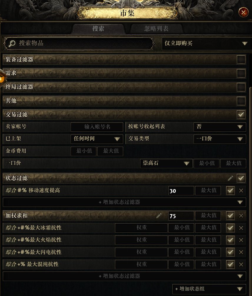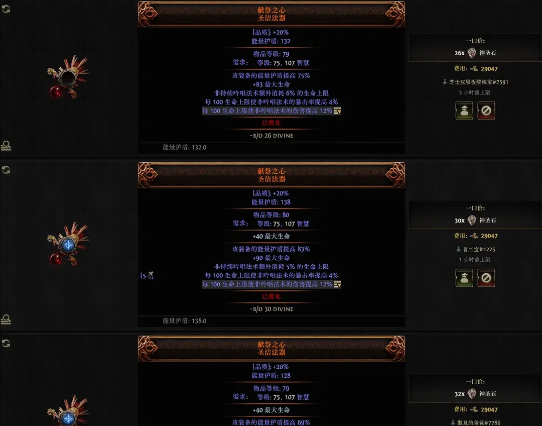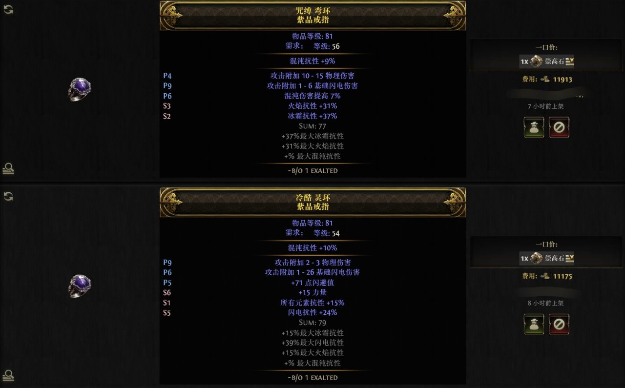 戒指挑选的时候优先看点伤和混沌属性抗性,可以看到戒指价格都还不错,成本1E可入。