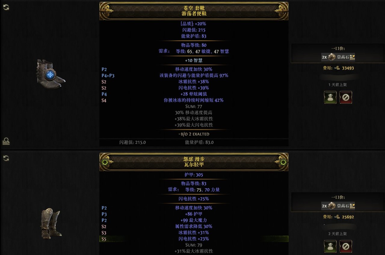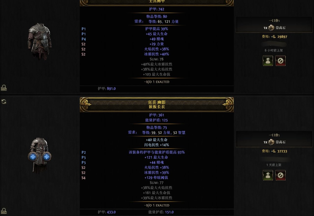 小二个人推荐选护甲和护盾底子,放弃一点闪避值,成本降低一大截,最终入手的第二件44精魂的胸甲,成本只需1E。