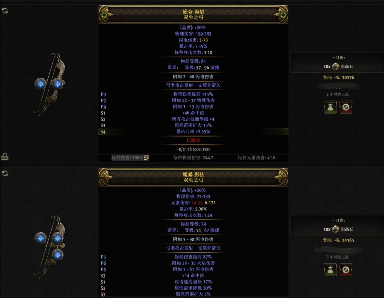 找到一把腐化三孔,还上好了闪电伤害的弓,入手成本10E,很明显这就是玩家淘汰下来的过度装。成本低很多,这也是为啥推荐萌新直接买的原因。