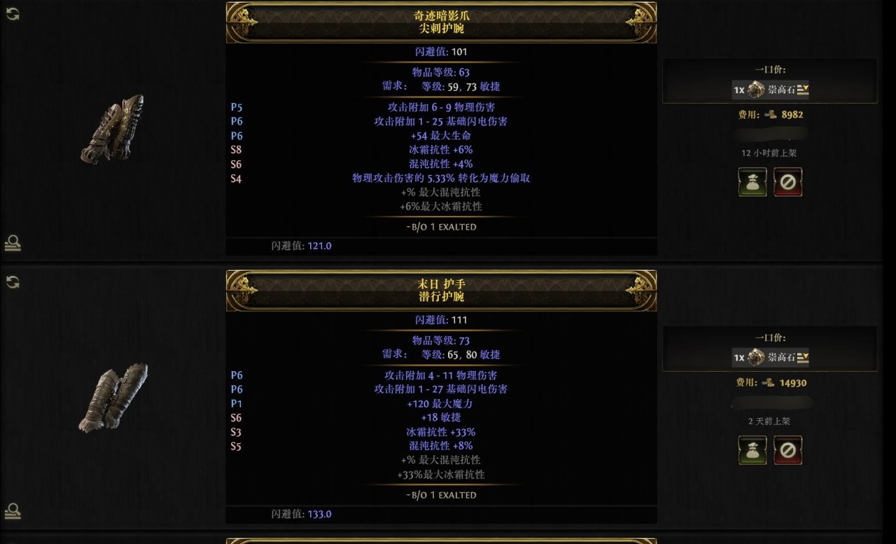 手套纯闪的也不贵,可以筛110以上的,然后要双点伤,外加混沌抗性。