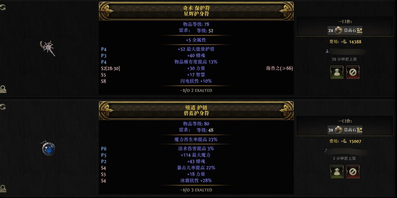 我走的是火电双捷,需要力量属性,所以最终2E入手了下方第一条项链,精魂40。