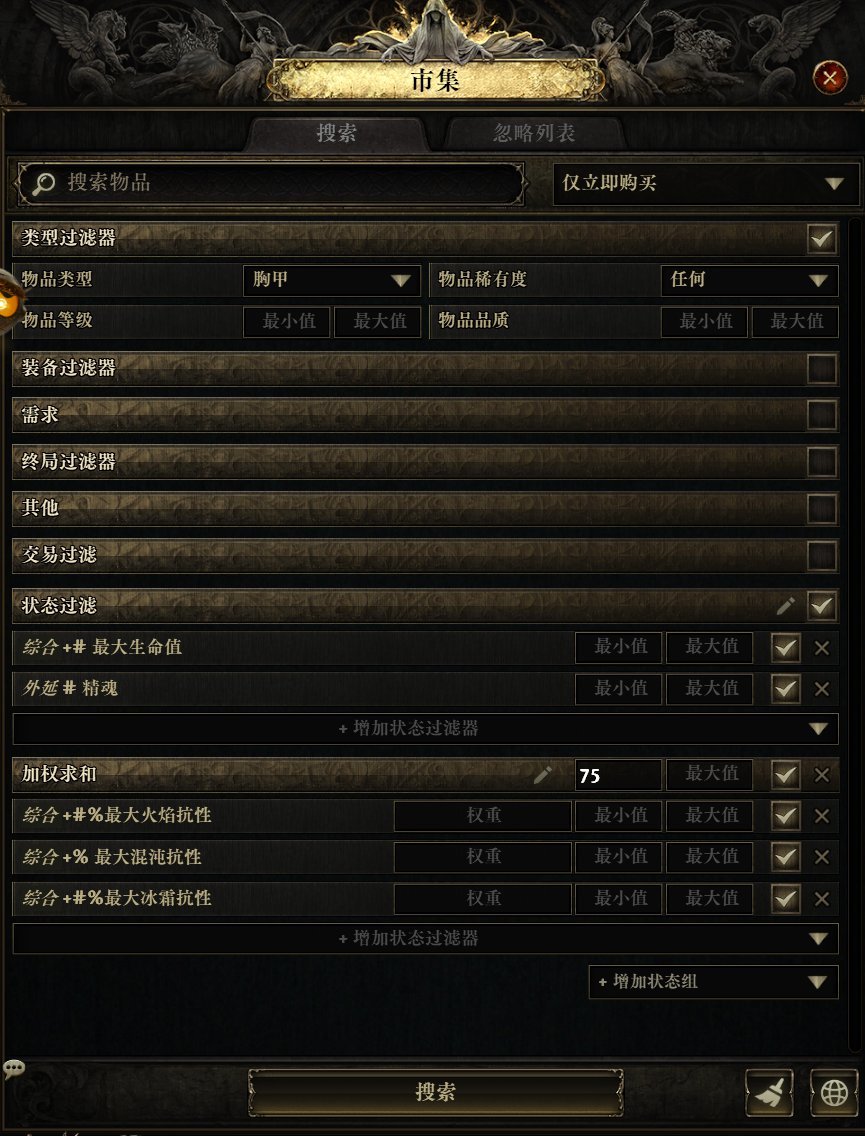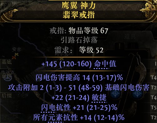 戒指需要补点伤和属性抗性,筛选的时候加上物理和闪电点伤,冰霜、火焰、闪电和混沌加权求和75以上即可。