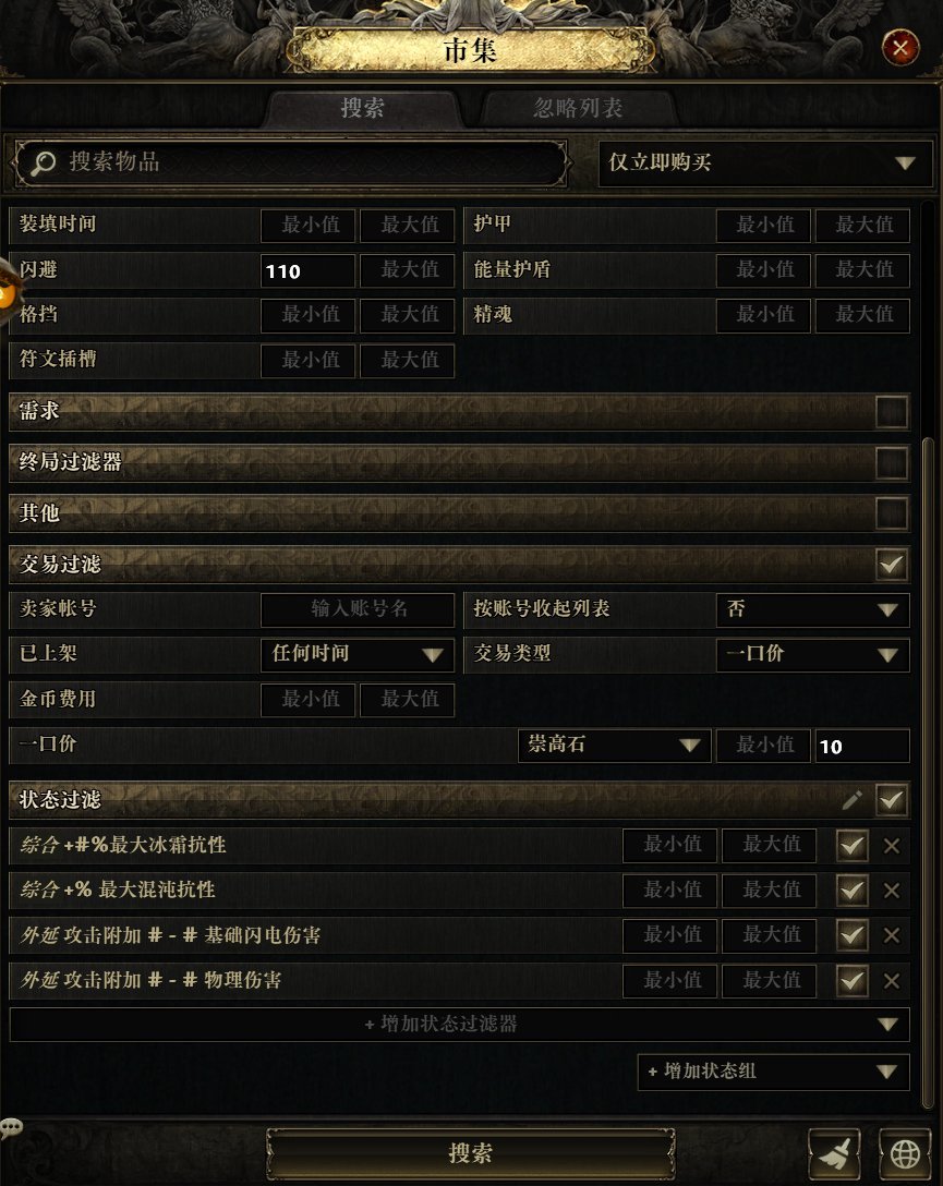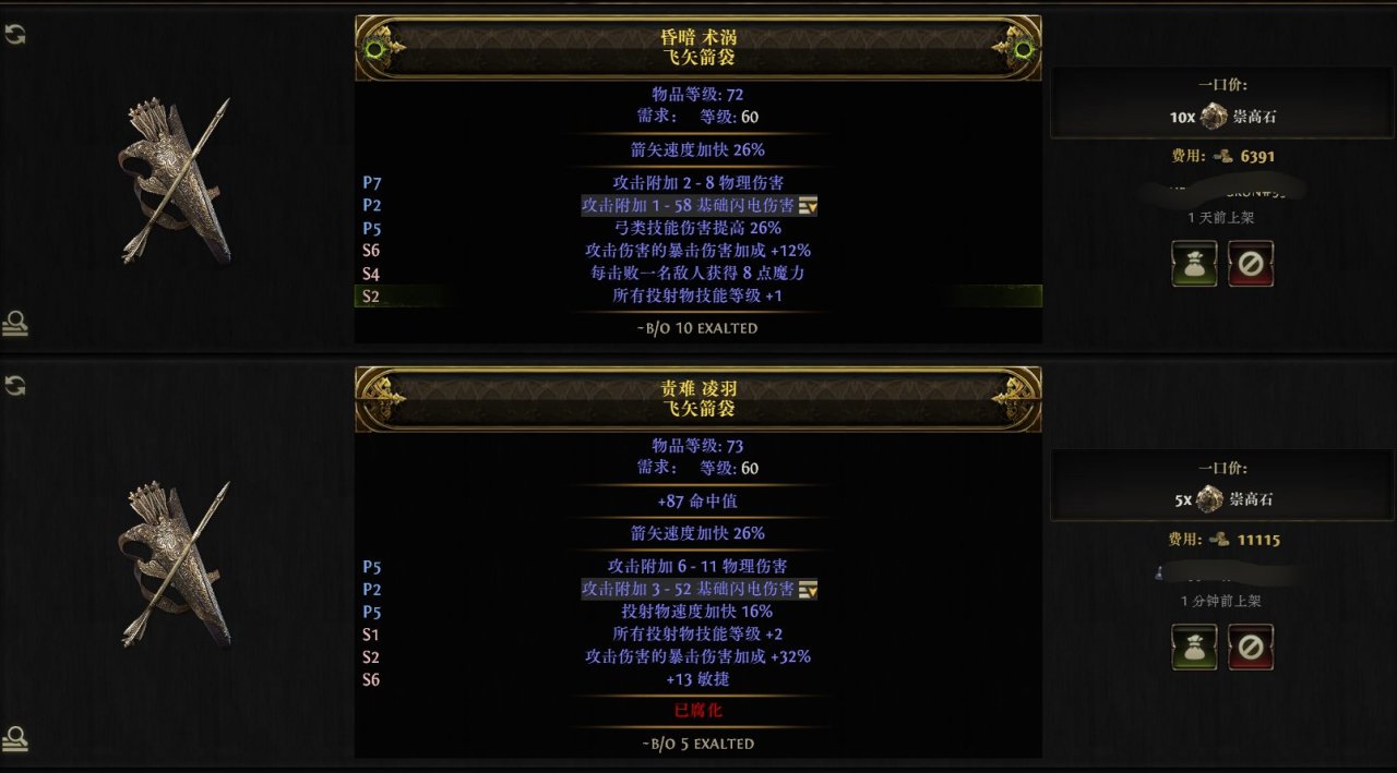 箭袋搜索飞矢箭袋,价格上限控制15E,状态过滤附加额外闪电伤害和物理伤害,也就是我们说的点伤。好一点的可以增加投射物等级筛选。