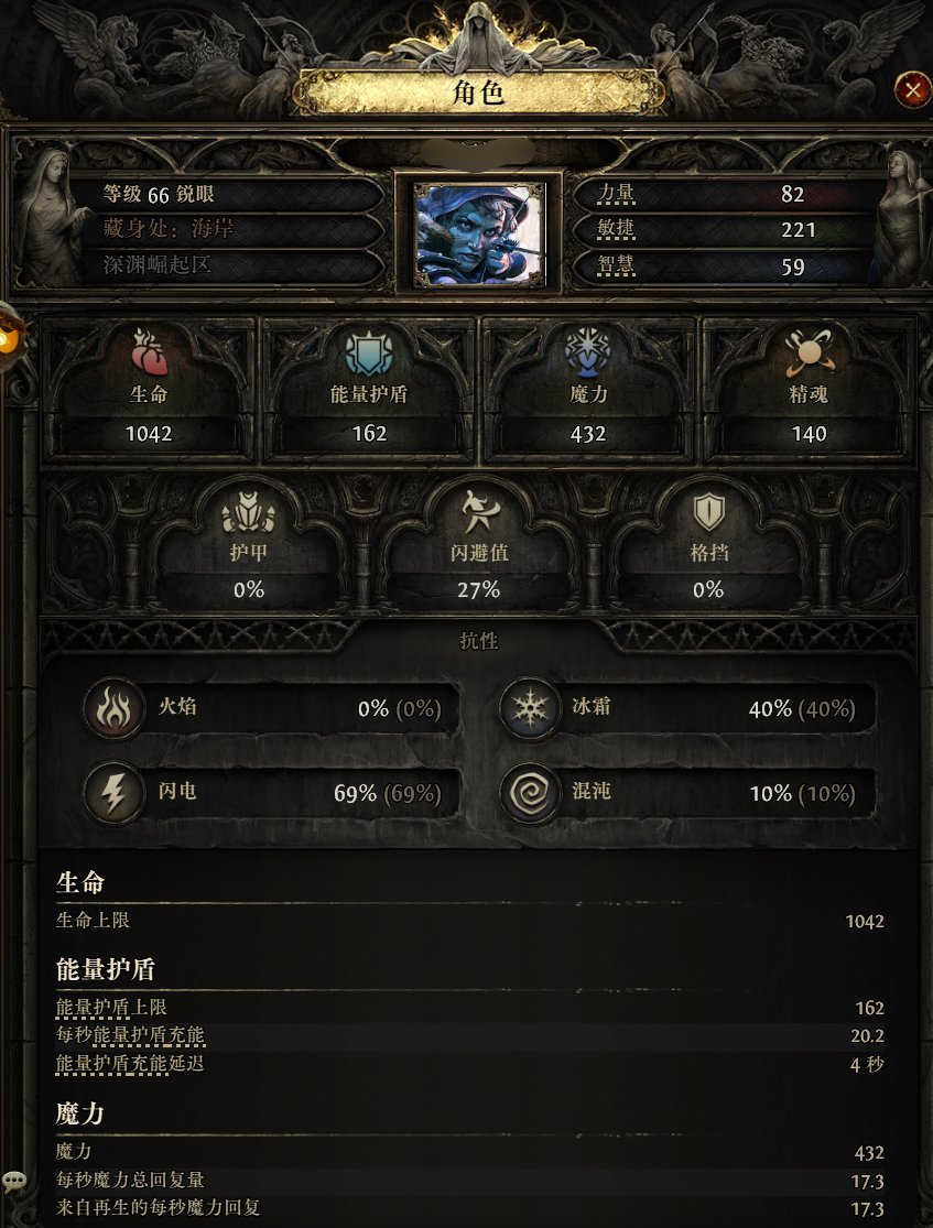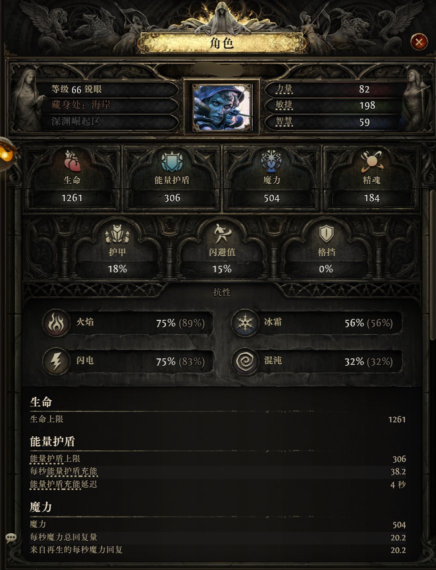 最终抗性火焰、冰霜和闪电都到了75%,混沌抗性低一些40%+,截图漏了,放一张过程中的应该没人发现吧。