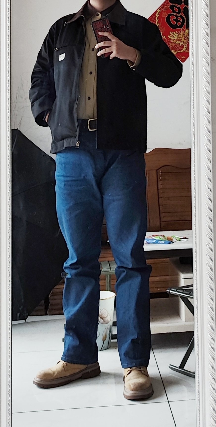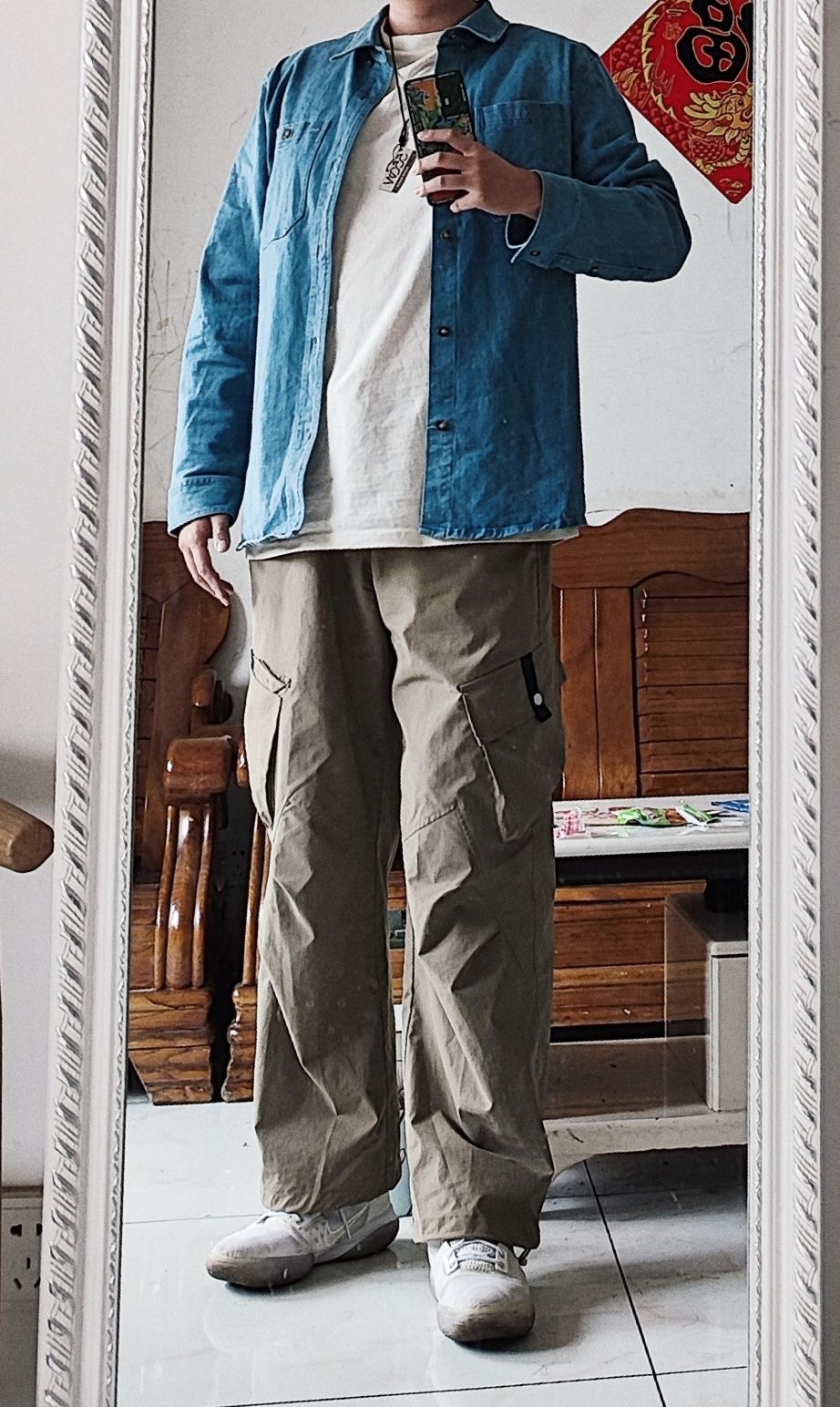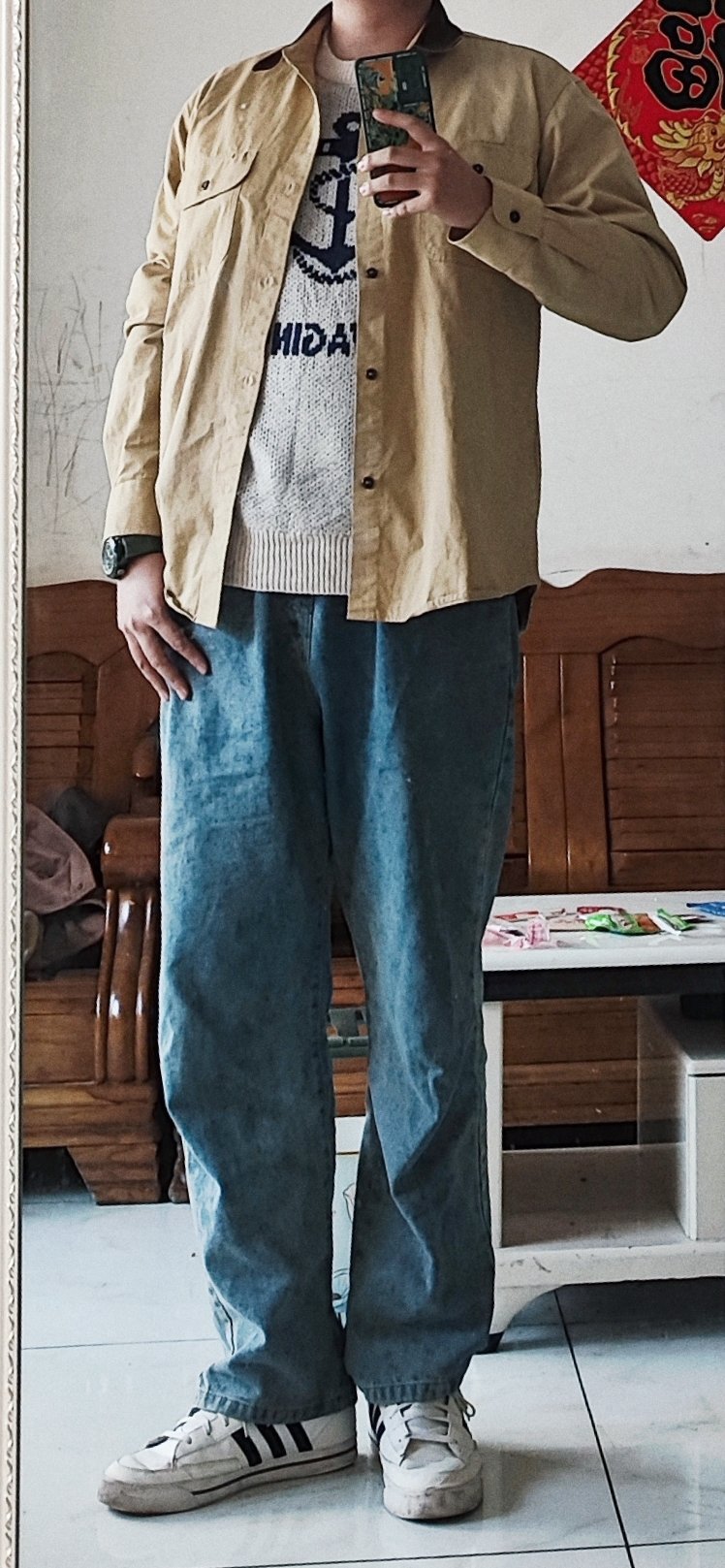 这件牛仔衬衫是bgsd的,推荐很多次了。37。是弹力布料,裁剪特别规整,缝线很结实,扣子也都是定制的,有一定厚度,面料挺硬,外观板正,但有点死板了。搭配正常裤子和宽松裤子都行,但是正常裤子更好