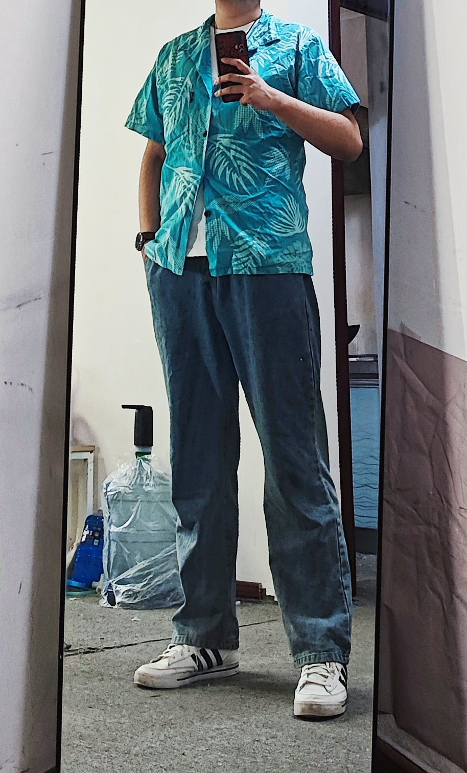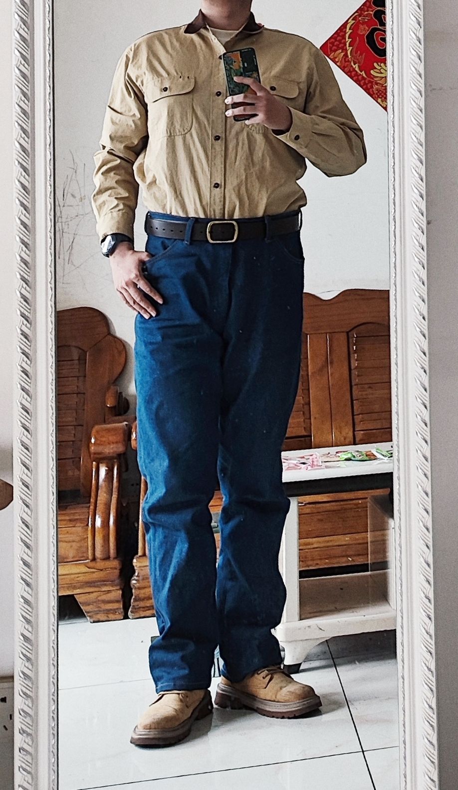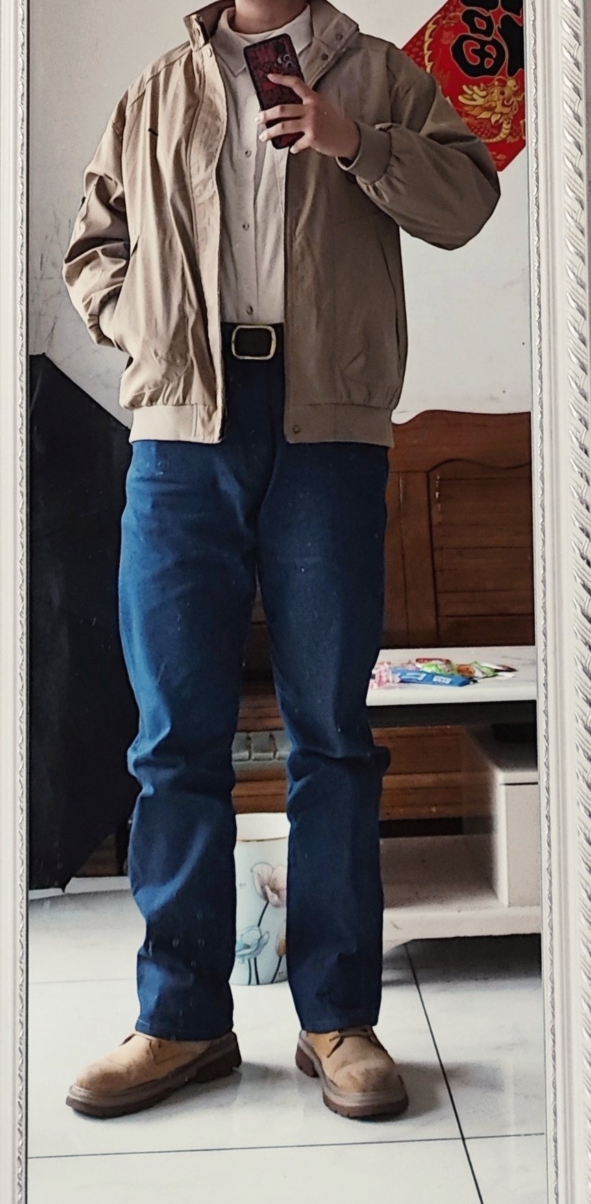 这件牛仔衬衫是bgsd的,推荐很多次了。37。是弹力布料,裁剪特别规整,缝线很结实,扣子也都是定制的,有一定厚度,面料挺硬,外观板正,但有点死板了。搭配正常裤子和宽松裤子都行,但是正常裤子更好