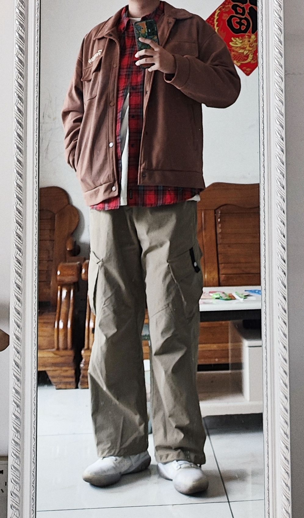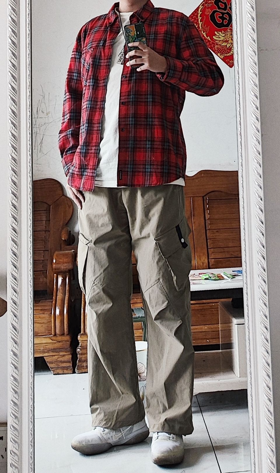 格子衬衫比较显老,所以一定要买宽松有版型的。这件是airwalk的红格子衬衫,25,质量还可以,主要是肩部有垫肩,看起来不错。程序员必备。