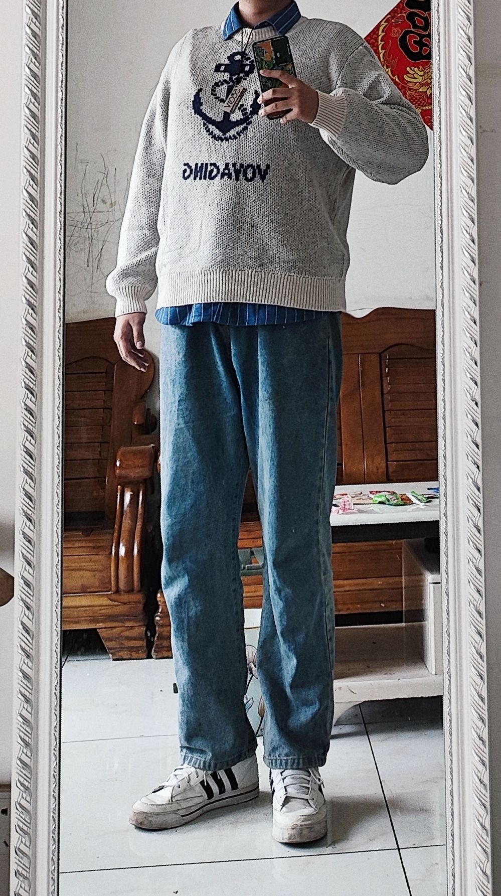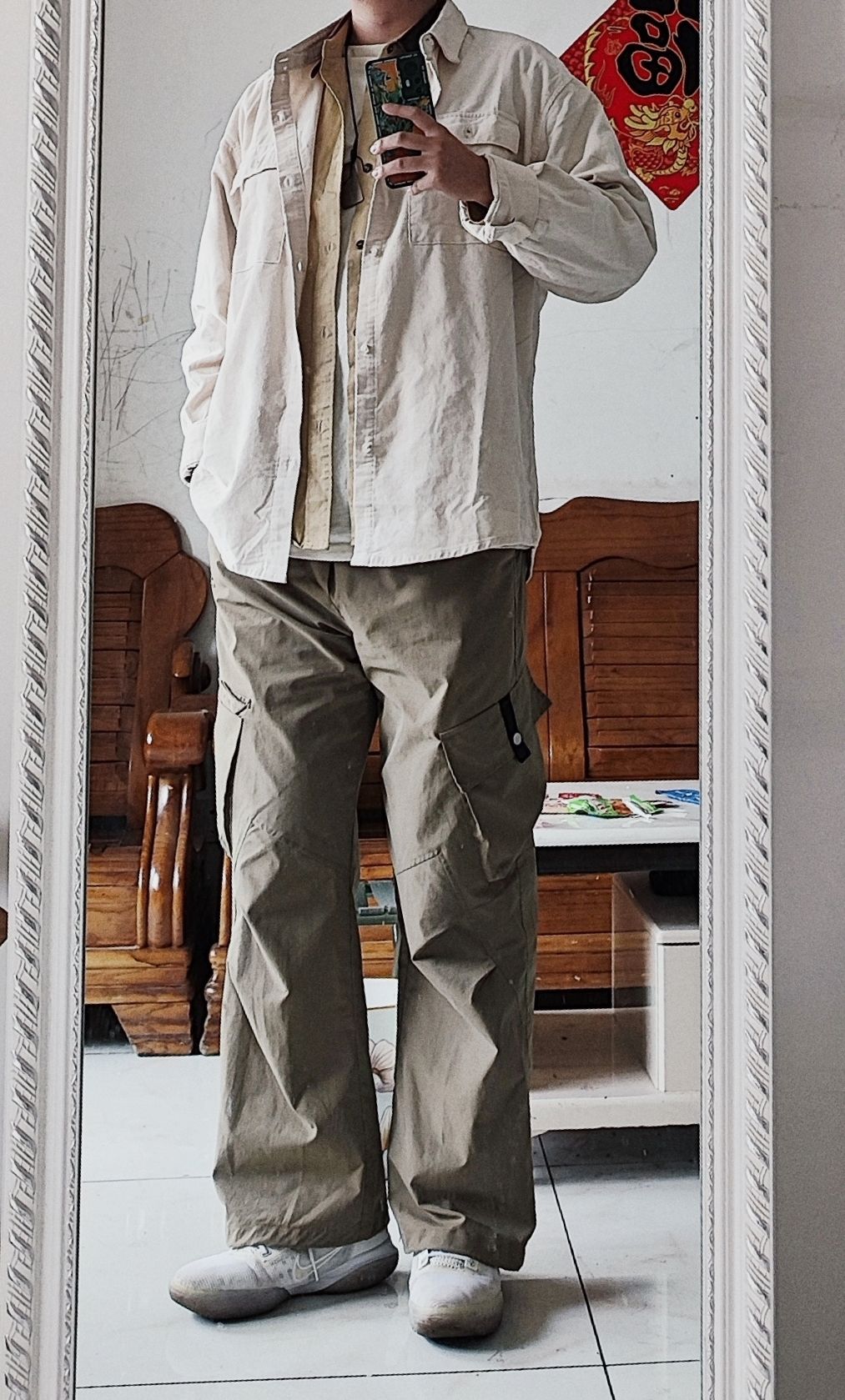 这个白衬衫在pdd随便搞的,19,没想到效果很不错,有一定厚度,穿起来很舒适。裤子是圣利卡,pdd47