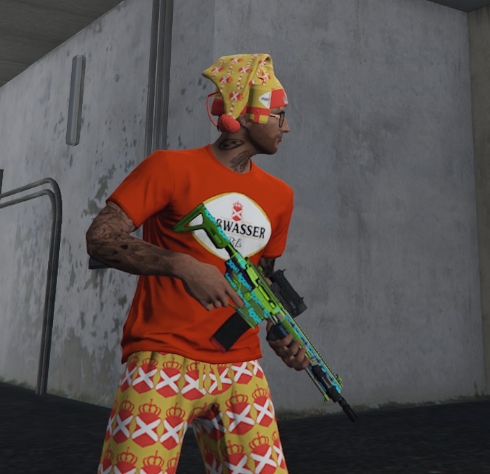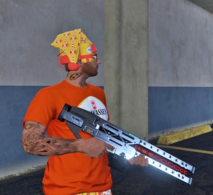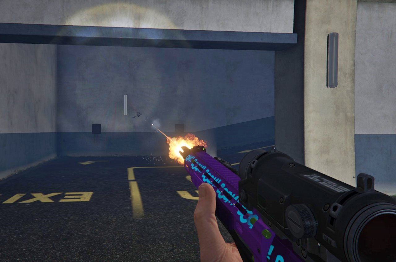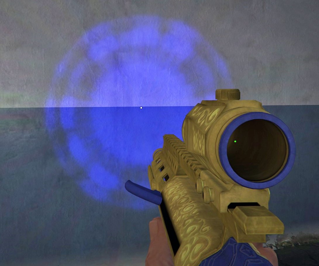 自帶奢華全包黃金雕紋槍身、唯一的紫色手電筒、自帶瞄準鏡、藍色曳光子彈、槍口制動器。