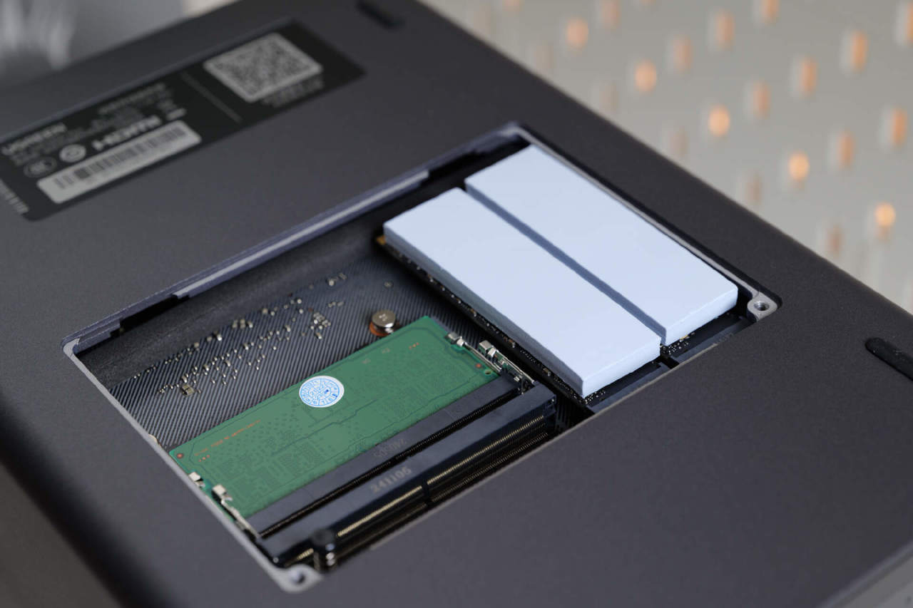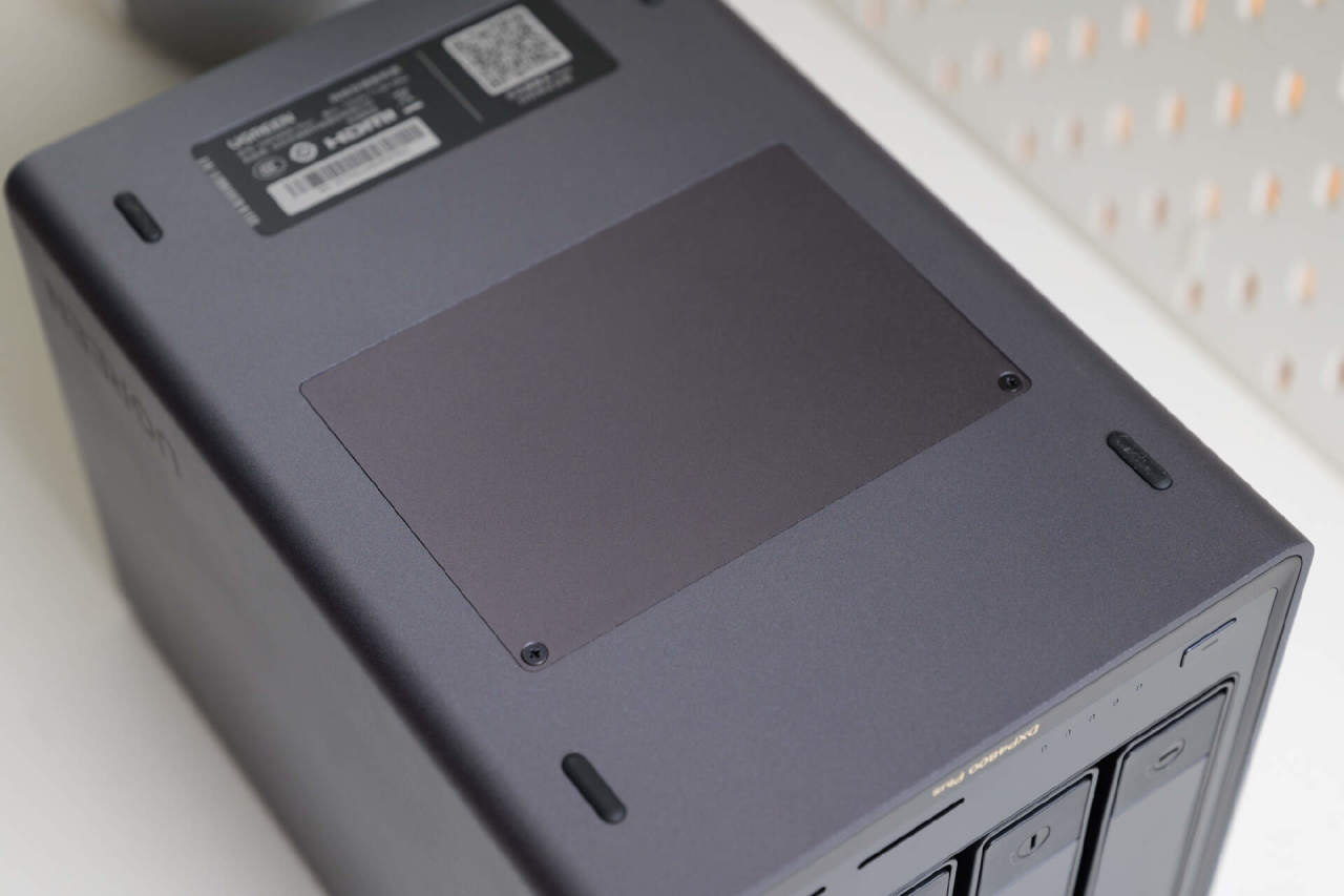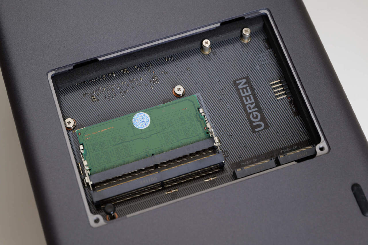 将绿联DXP4800 Plus翻个底朝天,可以看到还有一块可拆卸的盖板,打开之后可以在这里扩展内存,也可以插入两根2280规格的M.2 SSD。