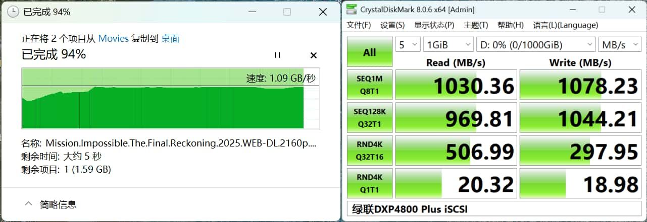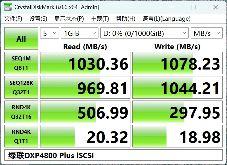 给这个iSCSI分区用CrystalDiskMark测一下性能,这速度要比SATA SSD还要好得多了,当个STEAM游戏盘或者素材存储盘完全没问题: