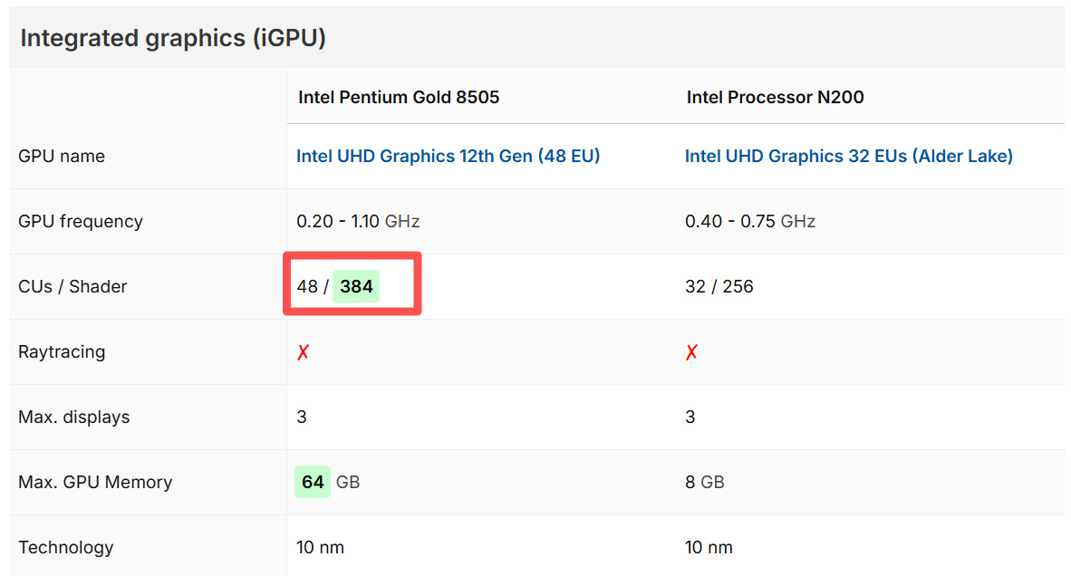 而且Intel Pentium Gold 8505的核显拥有48个执行单元和384个渲染器,也在视频播放、与编解码方面有更强的性能,接触过硬件解码、转码视频的朋友懂的都懂。