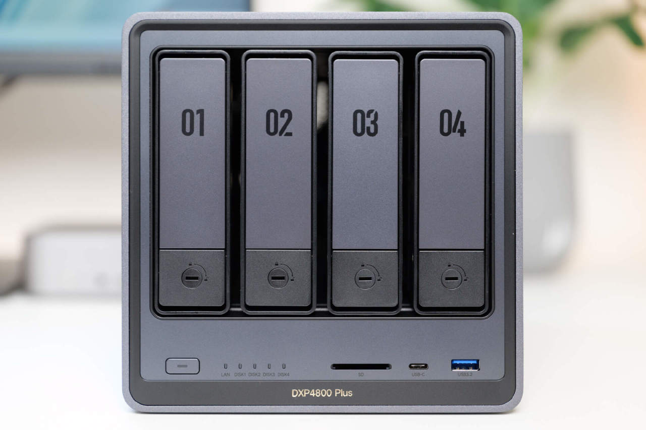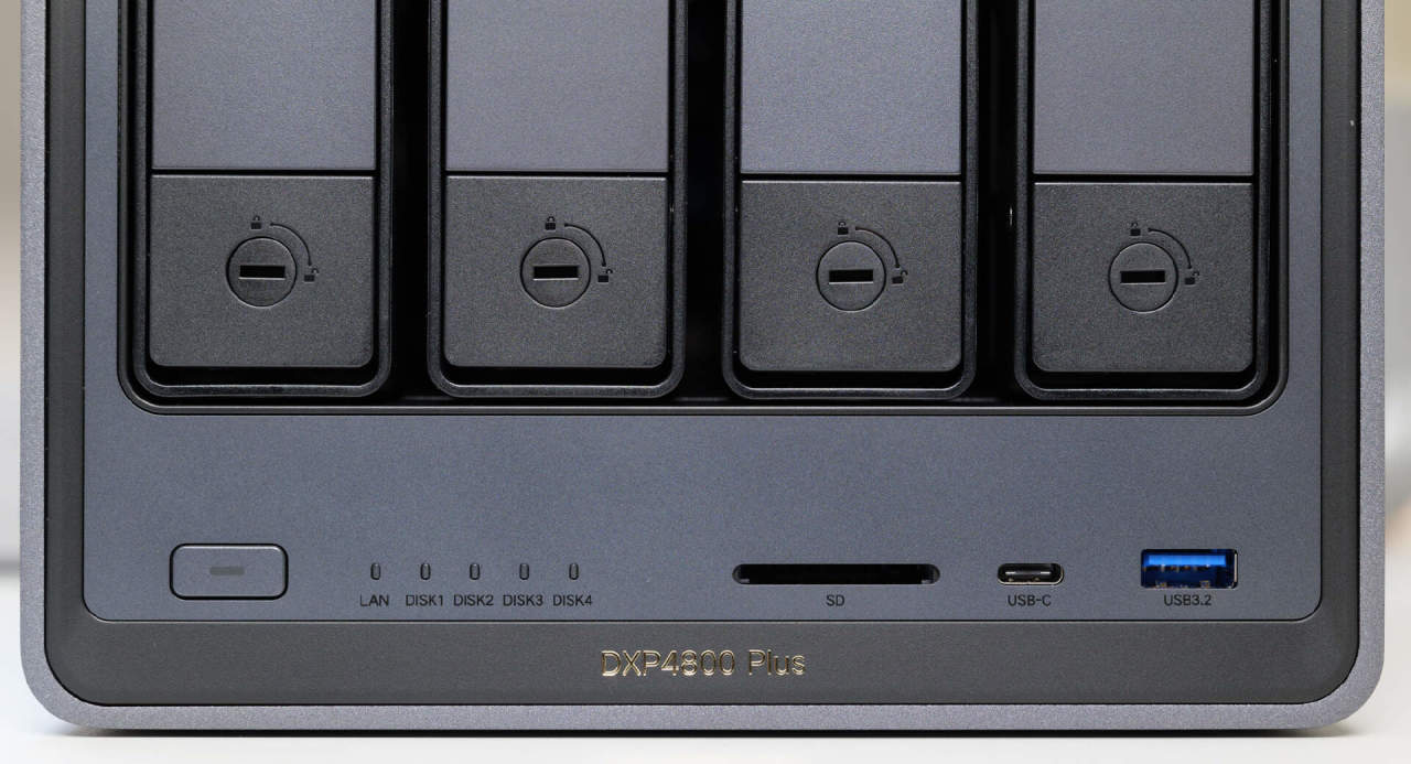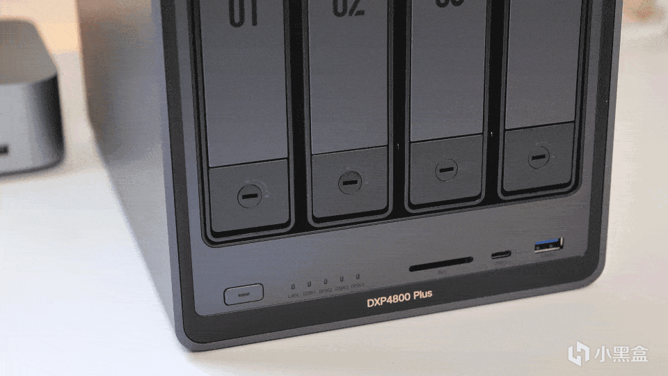 绿联DXP4800 Plus正面的接口比较丰富,除了硬盘笼以外,在下方自左向右依次为开机键、网络与硬盘笼的LED指示灯,以及一个SD3.0读卡槽位、1个Type-C 3.2 Gen2接口、USB 3.2 Gen 2接口。
