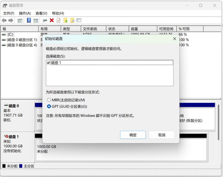 然后我们打开Windows的“磁盘管理”,就能看到一个需要初始化的磁盘,这就是我们刚刚添加的绿联DXP4800 Plus上的存储空间。