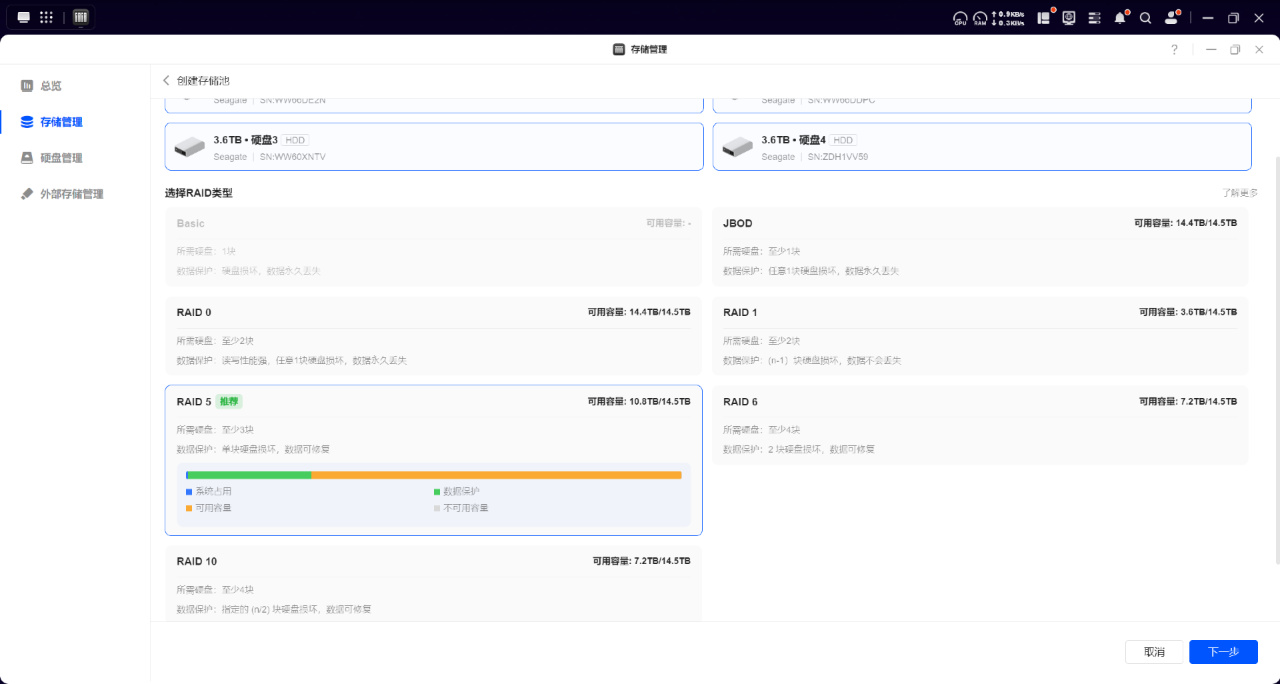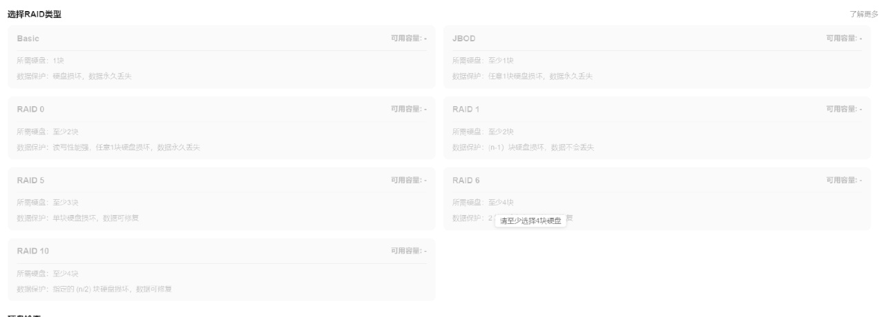 关于SATA硬盘的阵列类型,绿联UGOS Pro提供了Basic、JBOD、RAID 1 、RAID 5 、RAID 10、RAID 0 、RAID 6 共计七种模式。这里绿联做的引导着实不错,各模式的安全特性、硬盘数量以及可用容量等都介绍非常直观,对新手来说也可以很轻松看懂,大家可以根据自己的需求来选择。