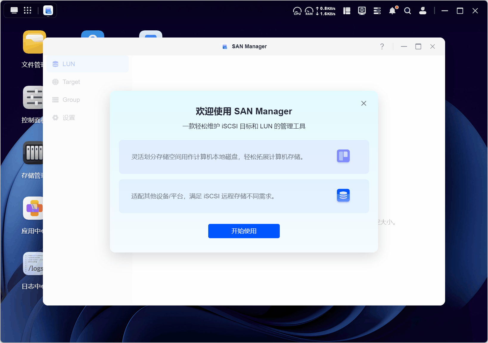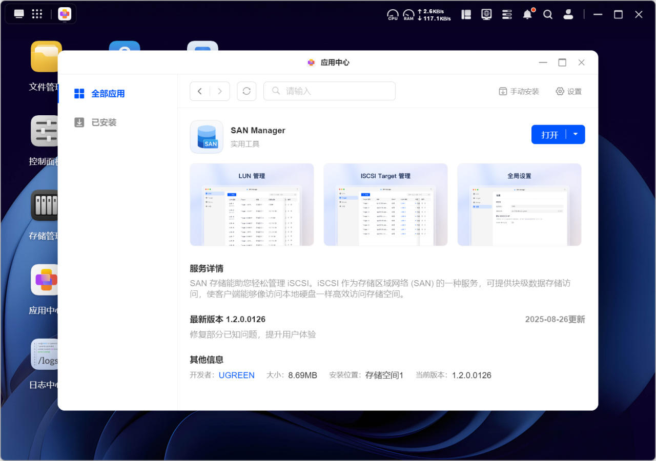 而实现方法很简单,我们首先去绿联应用中心下载SAN Manager套件,然后依次进行新增LUN、分配容量、新增Target的操作: