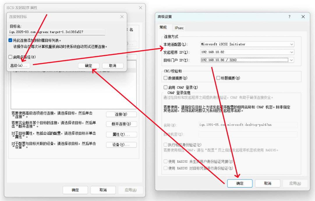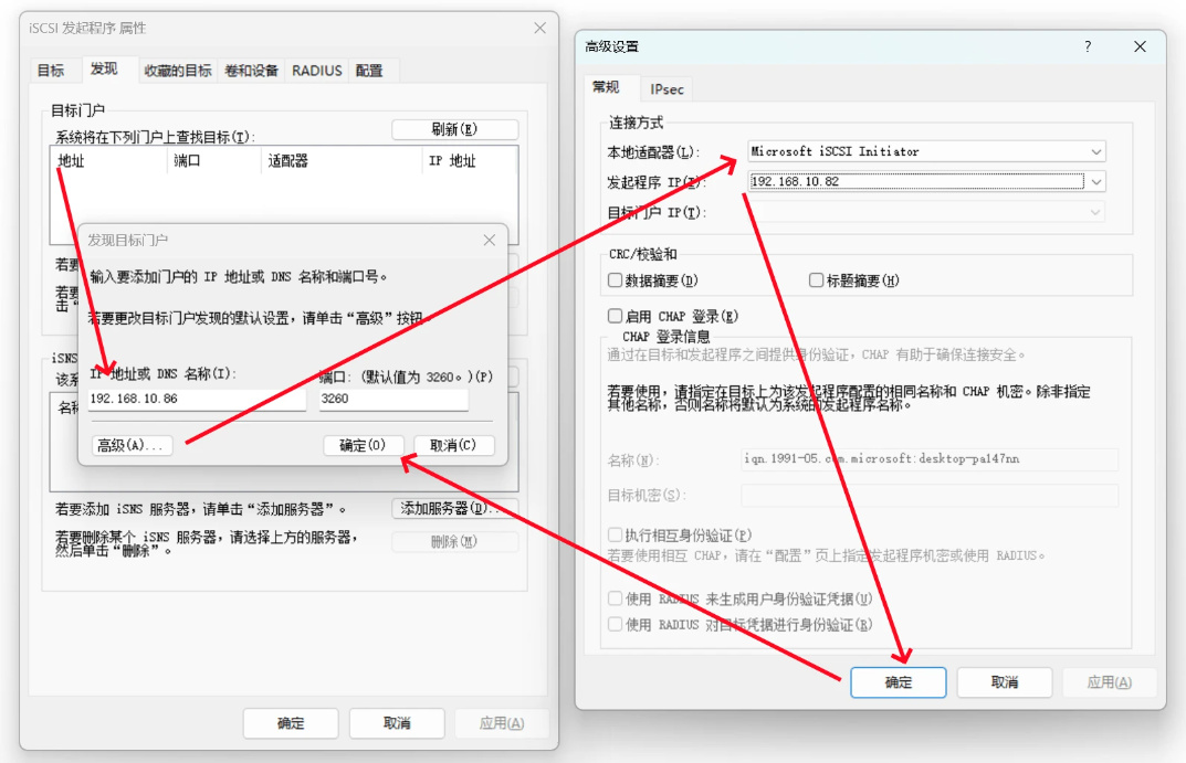 本地适配器选择MicrosoftiscSlInitiator,发起程序IP选择电脑本身的IP地址,最后点击“确定”,我们就完成了目标门户的添加。