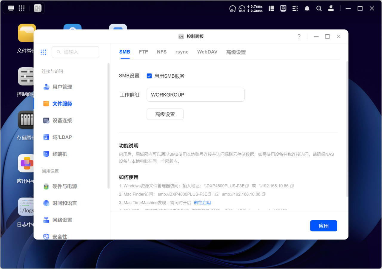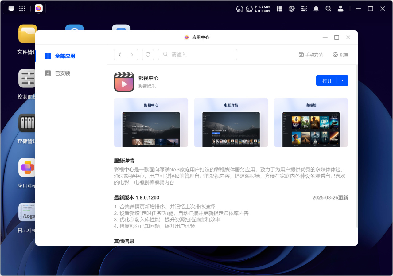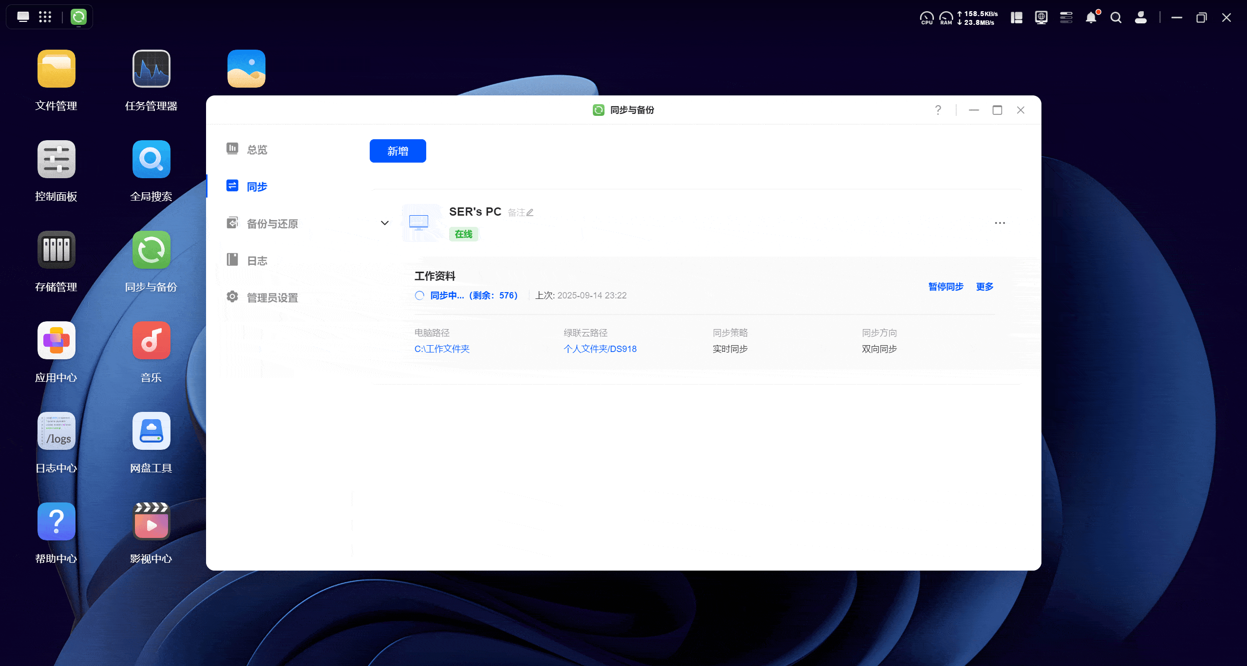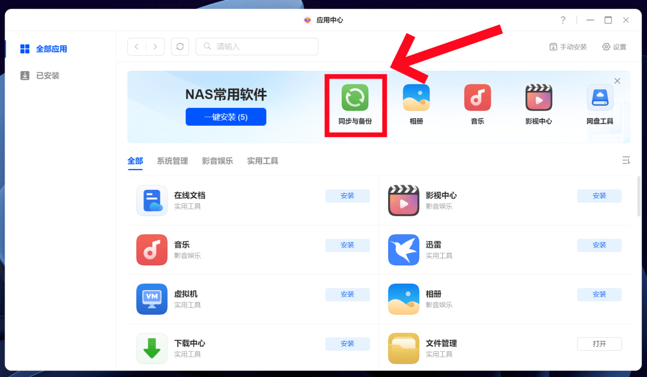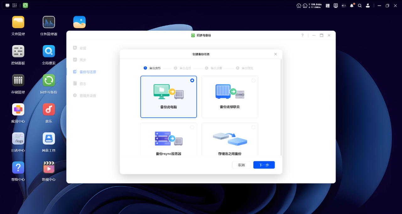 而除了手动备份外,我们还可以在应用中心下载“同步与备份“软件,这样就可以配置文件同步或者备份还原任务,实现自动化同步与备份数据的功能,用起来更加省心。