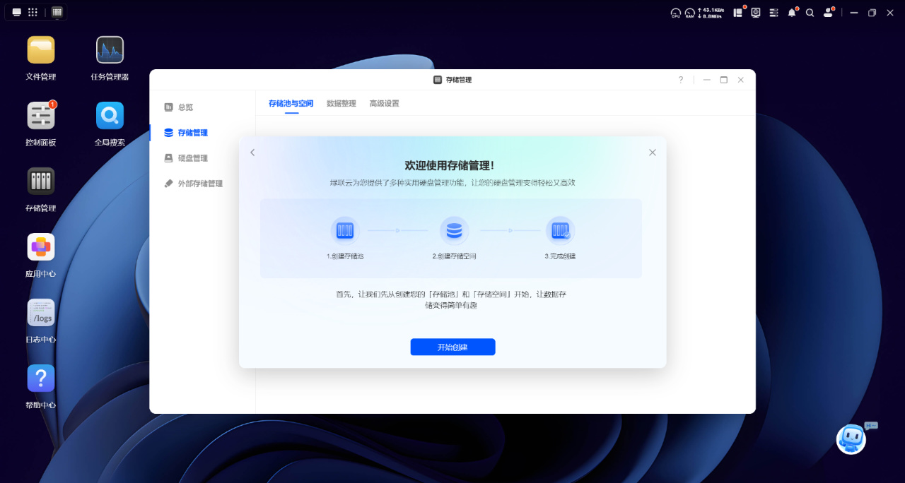 UGOS Pro完成初始化后,我们需要先点击“存储管理”创建存储池和存储空间,然后才能创建文件夹来保存管理数据。