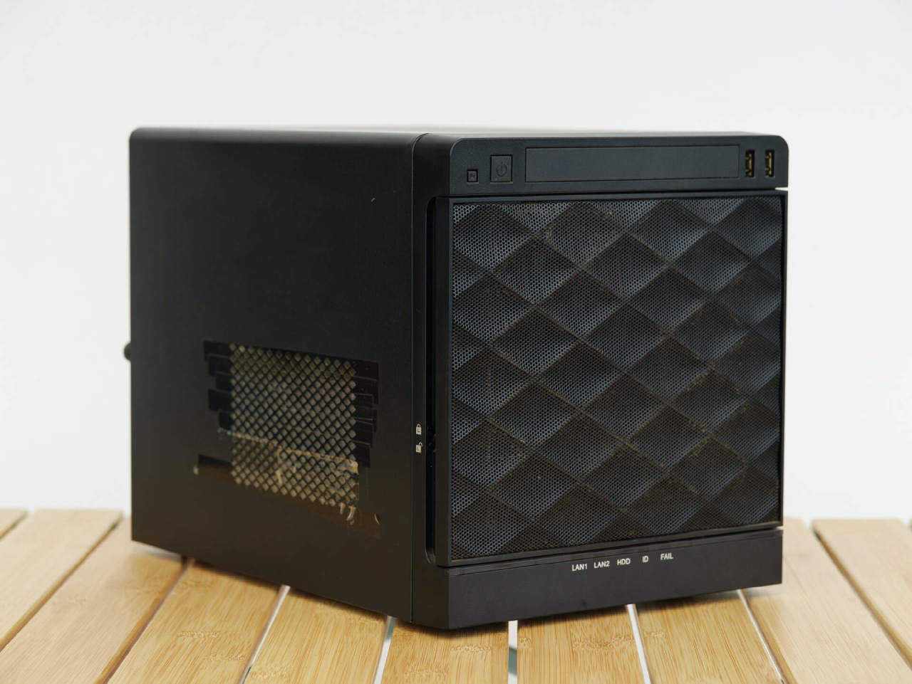 这台NAS的风道是后进前出,所以在风扇外设计了一个磁吸固定的金属防尘网,方便日常维护时取下清理。