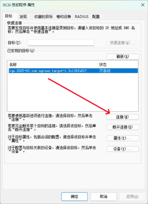 配置好发现门户之后,我们返回初始的“目标”标签页后就可以看到NAS上的iSCSI目标,接下来我们点击“连接“按钮:
