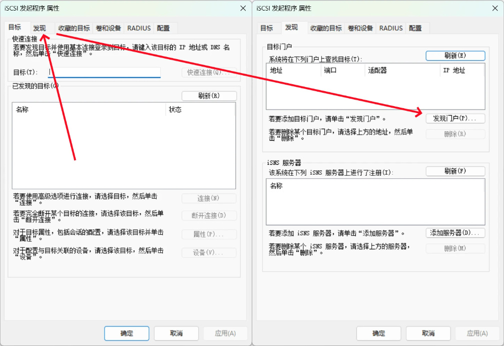 接下来打开iSCSI发起程序,依次点击“发现”,在打开的标签页中点击“发现门户”: