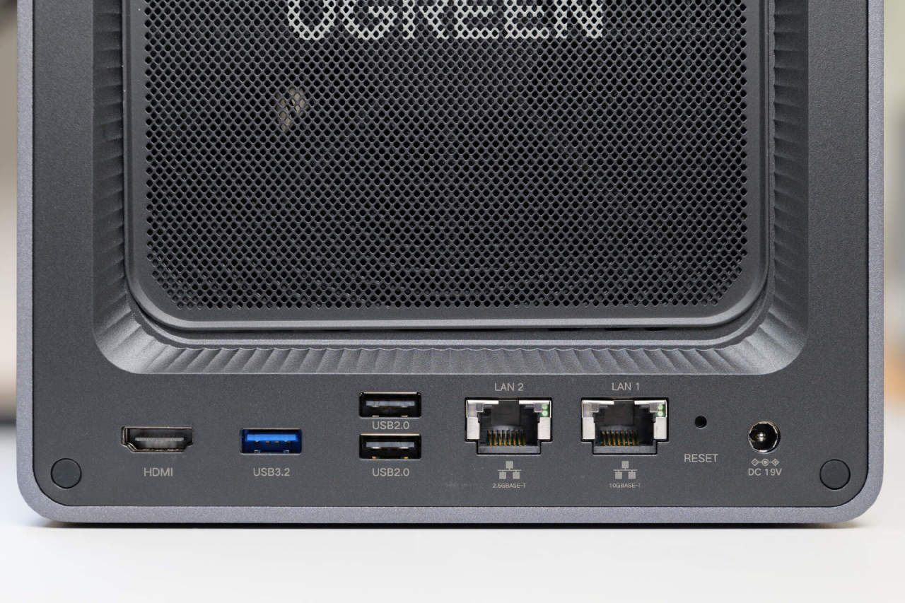 风扇下方自左向右分别有HDMI接口,1个USB3.2接口,2个USB 2.0接口,1个2.5G网口,1个10G万兆网口,以及RESET重置孔与19V的DC供电插孔。