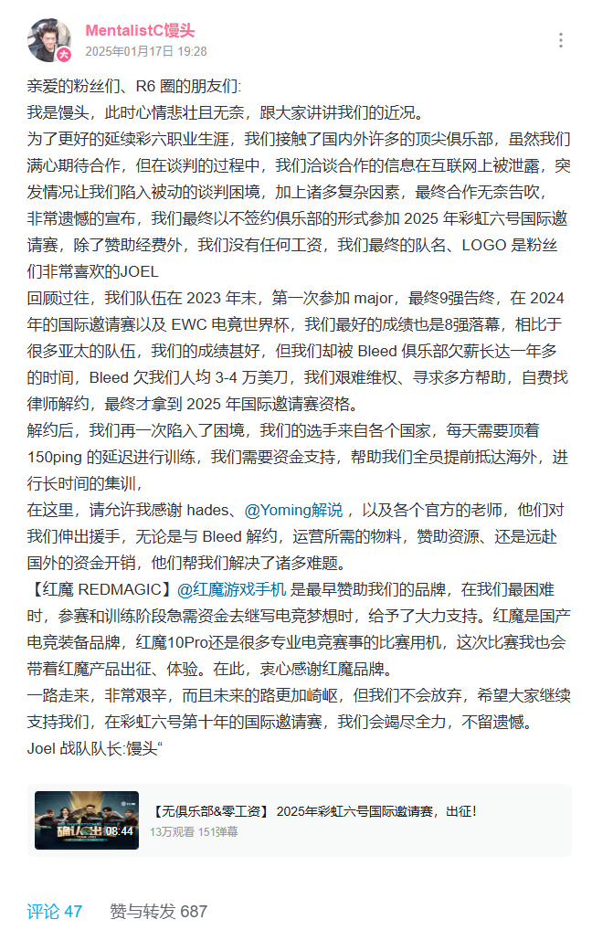 好比那些不得不自費參加SI 2025的選手們,就得到了包括育碧中國的協助、“紅魔遊戲手機”的品牌贊助。2025年3月,他們成功簽約微博,成爲WBG的R6分部。
