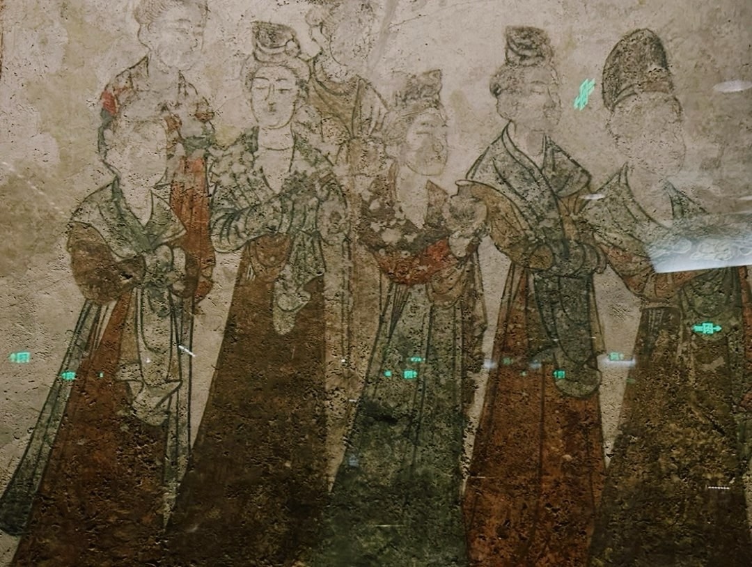 畫中一羣唐朝女官正在走路,唯有一位駐足停留,若有所思。