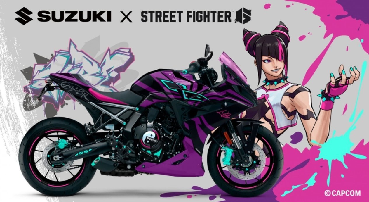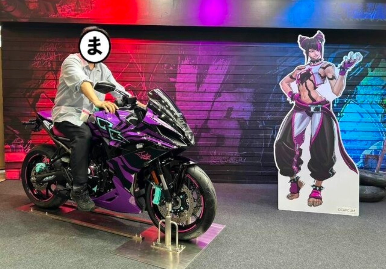 在2025年東京電玩展上,鈴木與卡普空聯手推出的《街頭霸王6》韓蛛俐聯名摩托車成爲展會亮點。這臺定製版GSX-8R Tuned by JURI採用韓蛛俐主題的炫彩紫色塗裝,車身融入標誌性蜘蛛圖案,與遊戲角色的獨特風格高度契合。