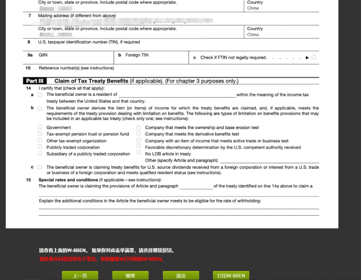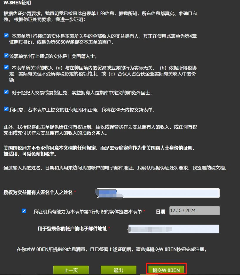 全部勾上,填好後,就可以點擊下方提交W-8BEN了。