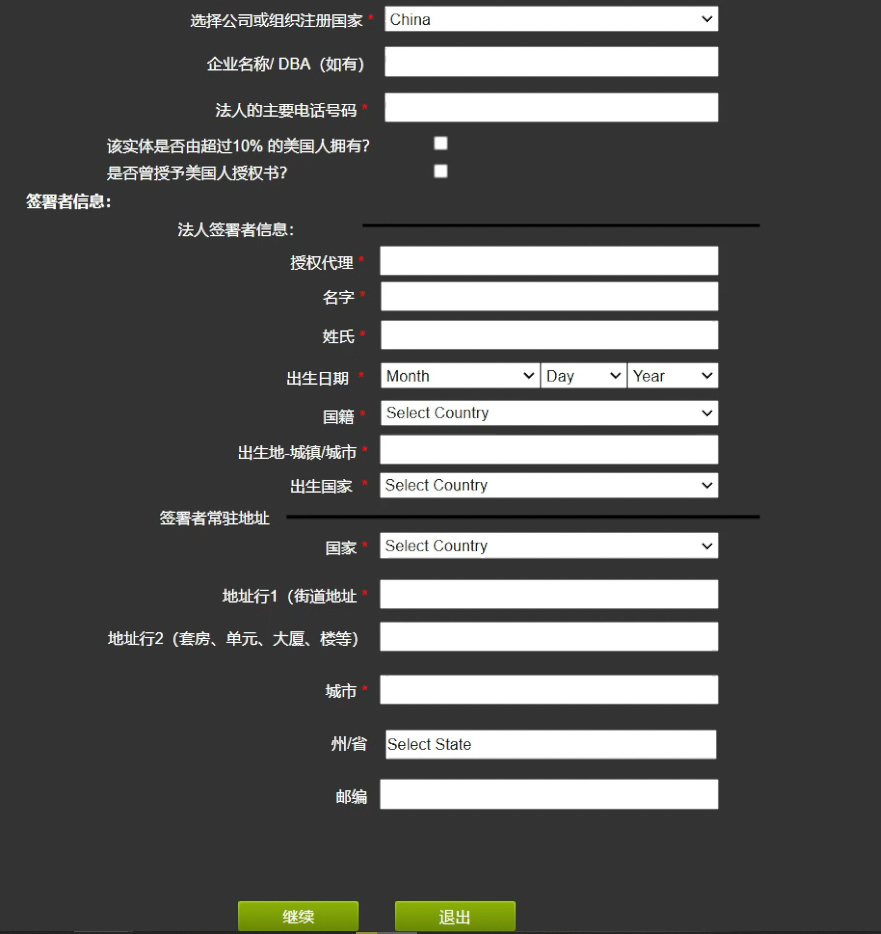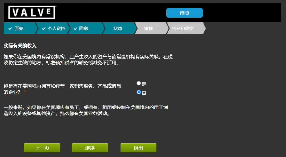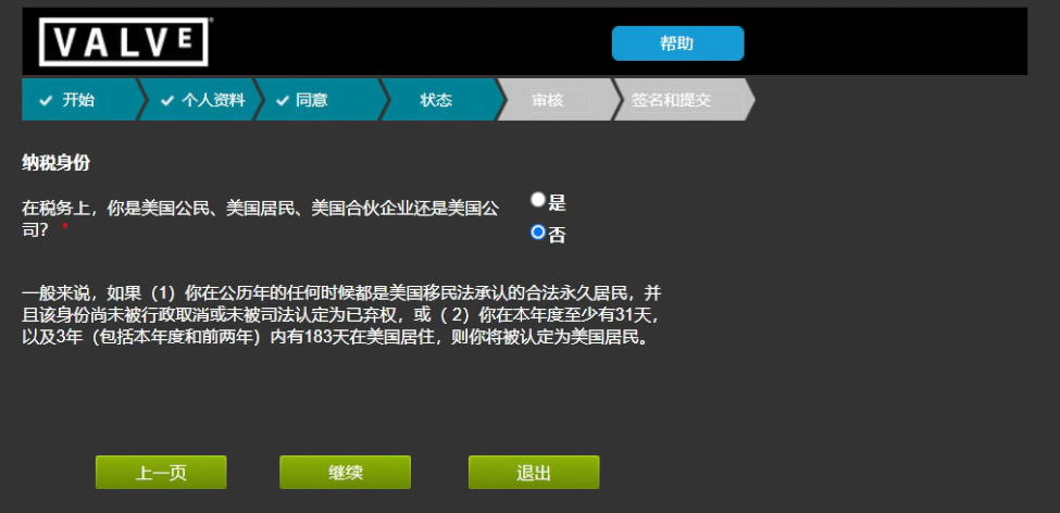 下一頁會詢問我們是否是美國公民或者美國公司,下面有詳細的描述,我們當然不是了~選擇否點擊綠色“繼續按鈕”。