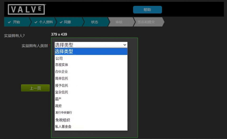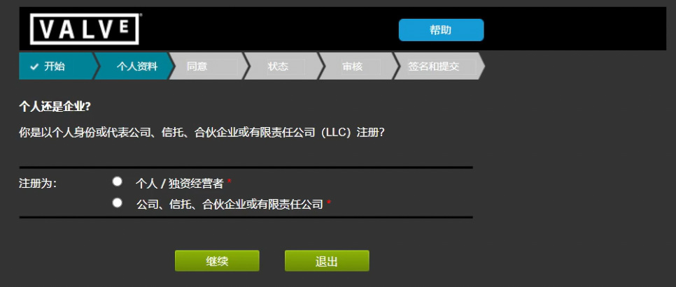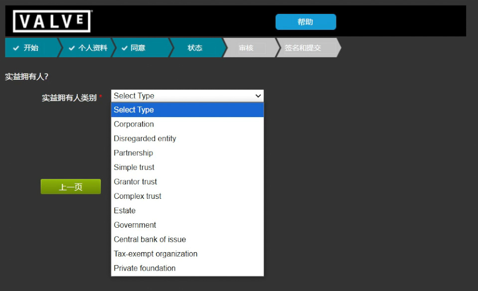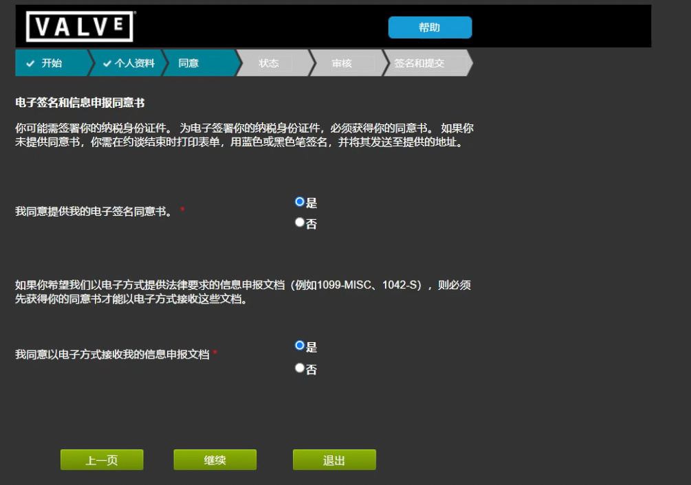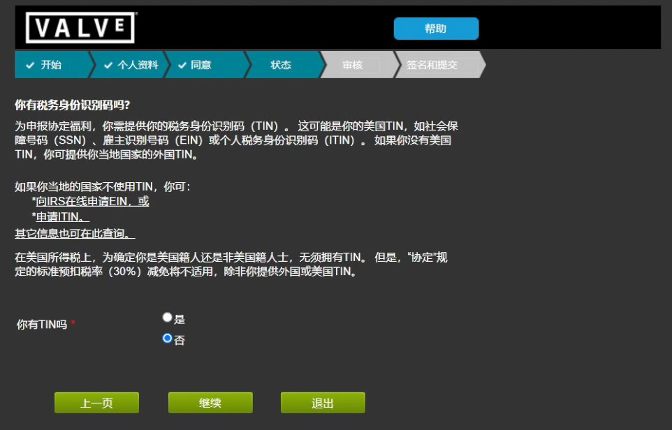 我們點擊進來後就看到了這個頁面,或者從Steam的郵件進入這裏,說我們的稅務信息馬上到期,讓我們趕快填寫,於是我們就趕緊點擊了左下角的Begin Tax Interview ,Steam好像爲數不多沒做翻譯的地方就是這裏。