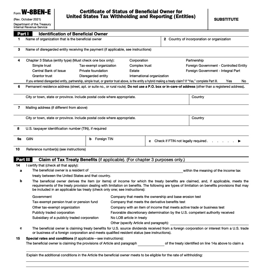 這裏放出完整的W-8BEN-E的表單給大家參考。