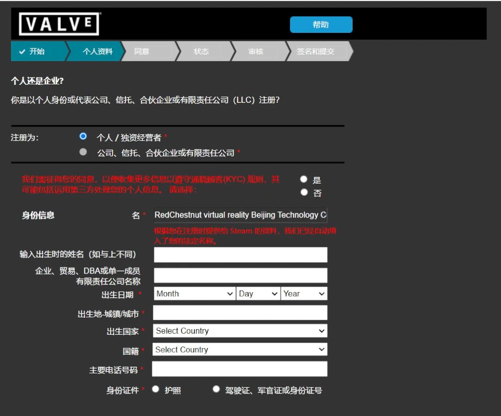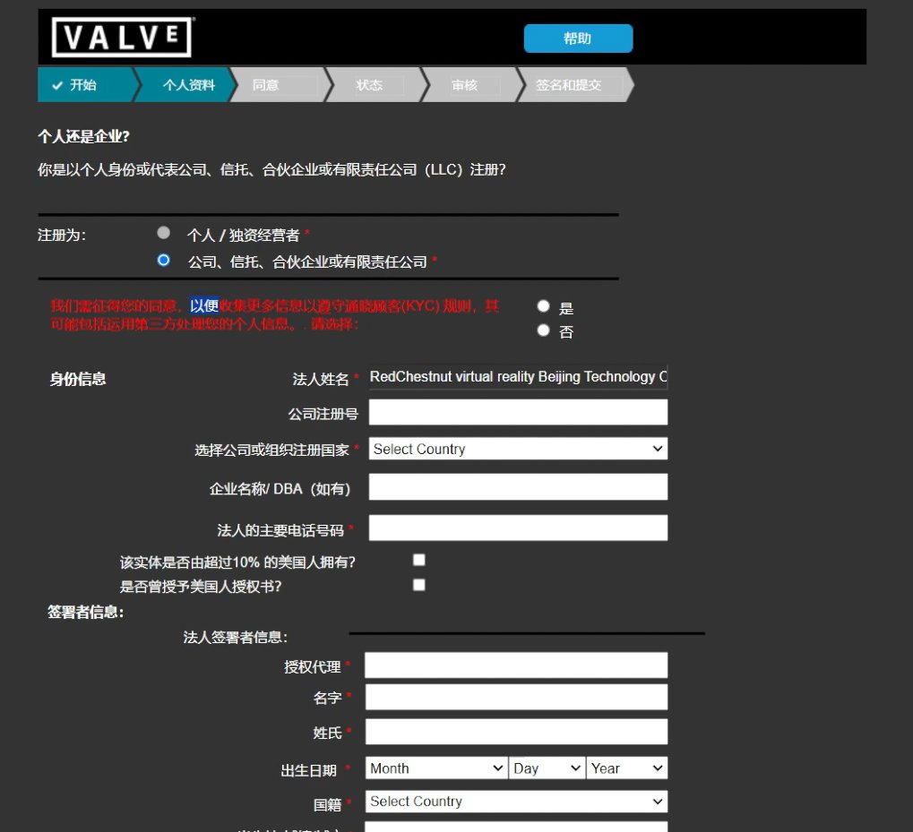 下面一半是長這樣的,主要是法人的信息填寫,這裏我們都用的是英文形式進行填寫的,方便Steam的工作人員查看。