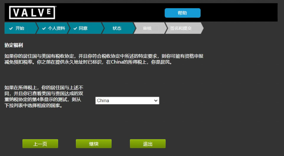 協定福利這裏,我們就選擇自己的國家就行了,具體的雙重稅協定Steam已經都有了,Steam會根據具體情況自動設置。