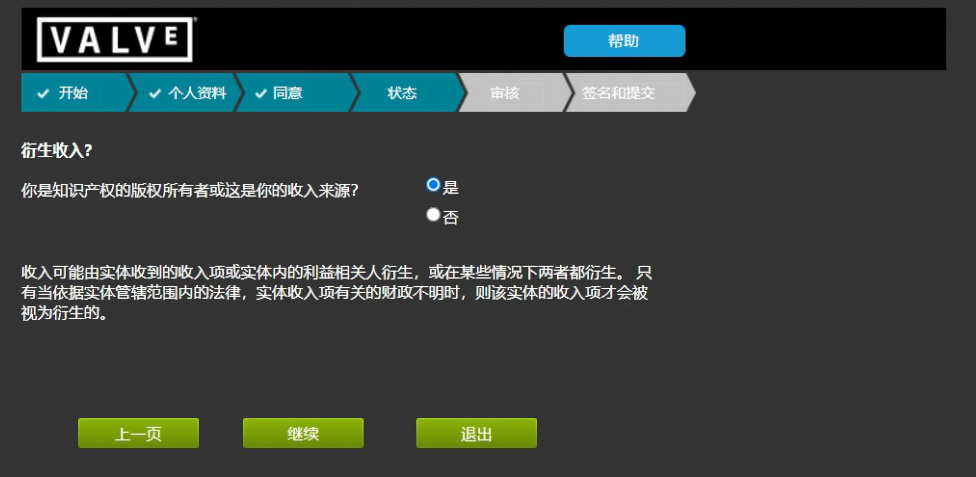 下一個是,“你是否是知識產權所有者或這是你的收入來源”,這裏是需要確定一下啊具體的版權問題。因爲遊戲是我們自己設計,自己開發的,所以我們選擇是。然後點擊綠色的“繼續”。