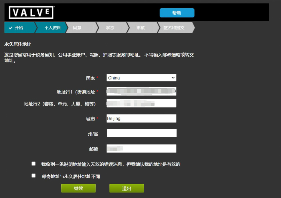 接下來是填寫居住地址,這個我們就如實填寫就行,最好還是填寫英文,不知道自己地址英文怎麼寫的,可以讓AI幫忙寫,填寫完後點擊繼續就行。如果彈出紅色文字說地址無效,但是你又確定你的地址是對的,那麼就勾上下面那條“我收到一條說明地址輸入無效的錯誤信息……”那一項。再如果郵寄地址和永久居住地址不一樣,就勾上下面“郵寄地址與永久居住地不同”然後補充填寫就行。一切都填妥了以後點擊綠色“繼續”按鈕。