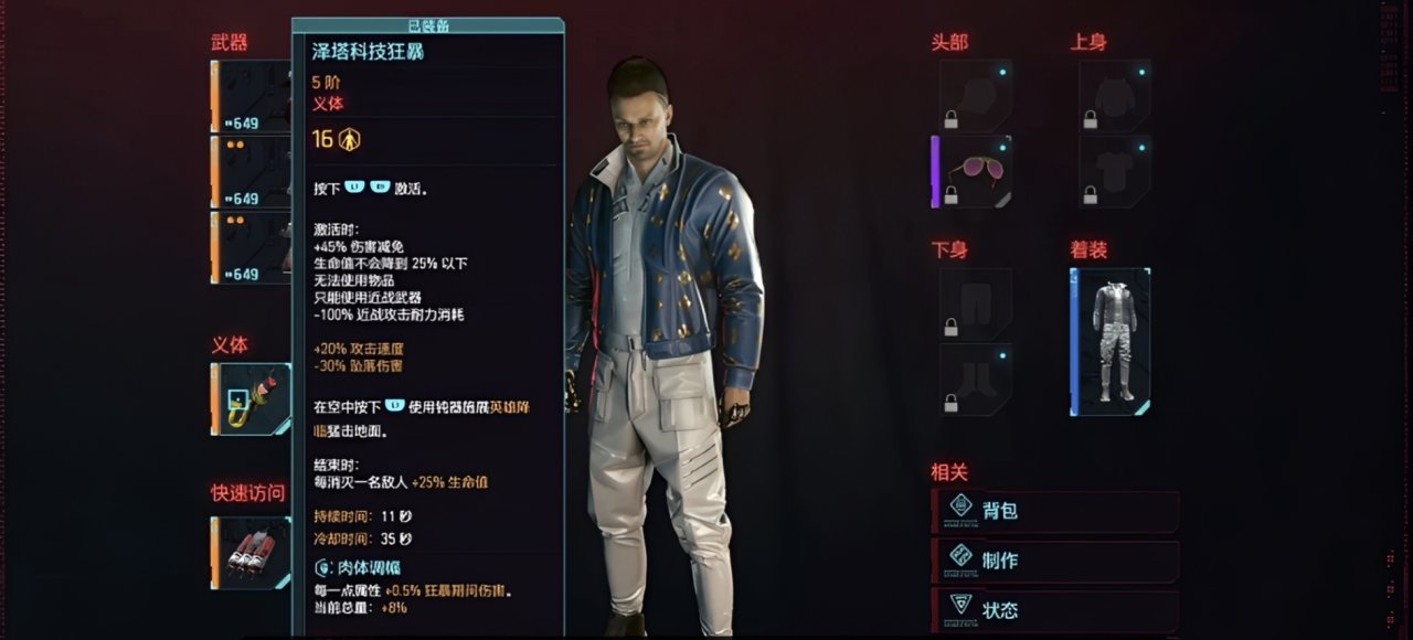 裝備澤塔科技狂暴義體(技能介紹中有按“Q”使用英雄降臨技能),裝備鈍器類武器。