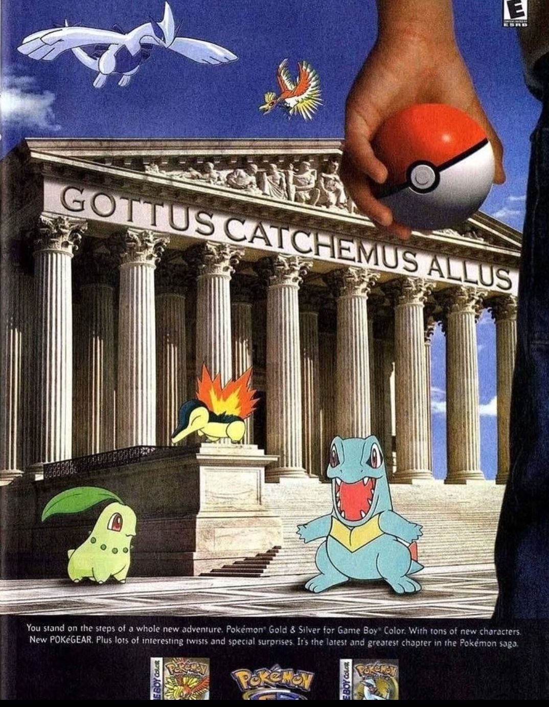 在《宝可梦 金/银》的广告中,制作方将美国国会大厦的外观进行了创意改编,把上面的文字改成了“GOTTUS CATCHEMUS ALLUS”(谐音宝可梦的经典口号“Gotta Catch ‘Em All”),用这种充满戏谑感的方式,把宝可梦“收集全图鉴”的核心玩法和美国标志性建筑结合,制造出强烈的视觉冲击和脑洞笑点,是2000年代游戏广告“疯癫创意”的典型体现。