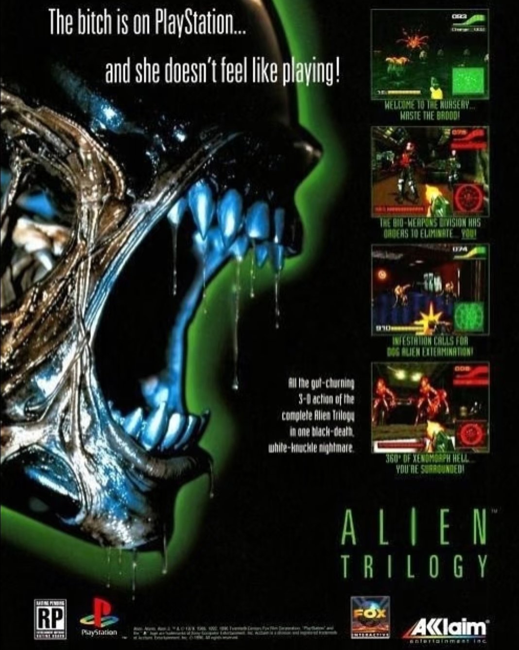 “这老乡鸡在 PlayStation 上,而且没心情玩游戏!”(The bitch is on PlayStation... and she doesn’t feel like playing!),把异形的压迫感和玩家的征服欲拉满