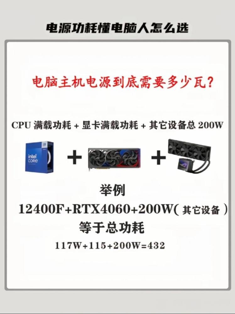 · i5-12400F(117W) + RTX 4060(115W) + 200W ≈ 432W 實際選購時,建議總功率在此基礎上增加20%~30%冗餘。例如432W需求,推薦選擇550W~650W電源,以應對瞬時功耗峯值並延長電源壽命。