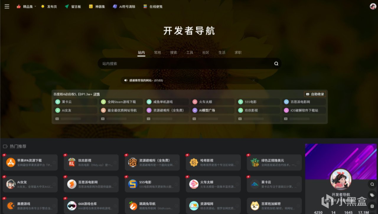 開發者導航網是一個爲廣大用戶提供免費工具和稀缺資源的寶藏網站,作爲資源導航領域的佼佼者,它收錄了4000+優質網站,涵蓋免費影視、辦公工具、學習資源、設計素材、遊戲等近百個分類。無論是上班族、學生、程序員還是二次元愛好者,都能在這裏找到所需資源,堪稱“上網必備高效導航”。