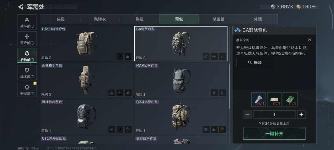 至少20格子的背包。确保有足够空间容纳你的“战利品”。ga野战和棺材包都很好用,若战备不够可选大紫包,甚至金包。