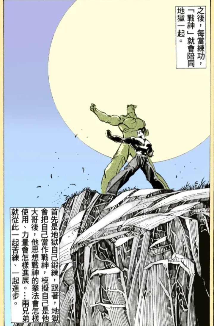 不仅如此,地狱还发现了自己在爆发力量时自己脑海里出现的大哥战神的感觉,凭借那感觉地狱便思索着如果大哥还活着会怎样修炼、会怎样教导自己,渐渐的地狱便将思想一分为二,在自己修炼后又模拟着大哥的修炼方式,从此“两兄弟”便在一起修炼、进步。
