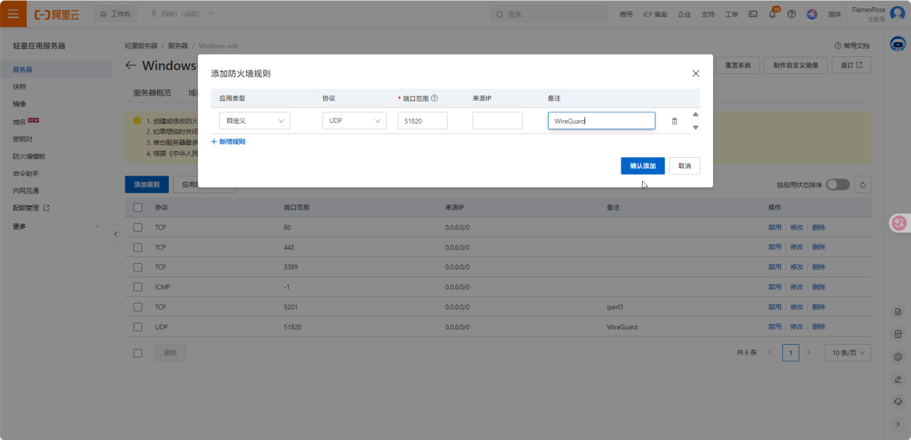 點擊服務器名稱後,選擇防火牆,添加UPD的51820端口
