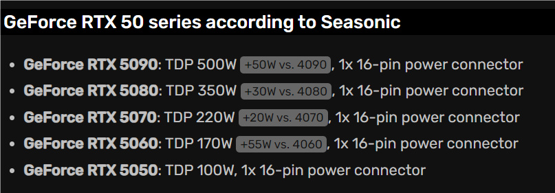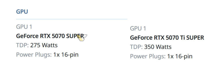 海韻給出的功率中,RTX 5070SUPER需要275W的TDP,而RTX 5070Ti SUPER則爲350W,都採用單支16Pin供電。