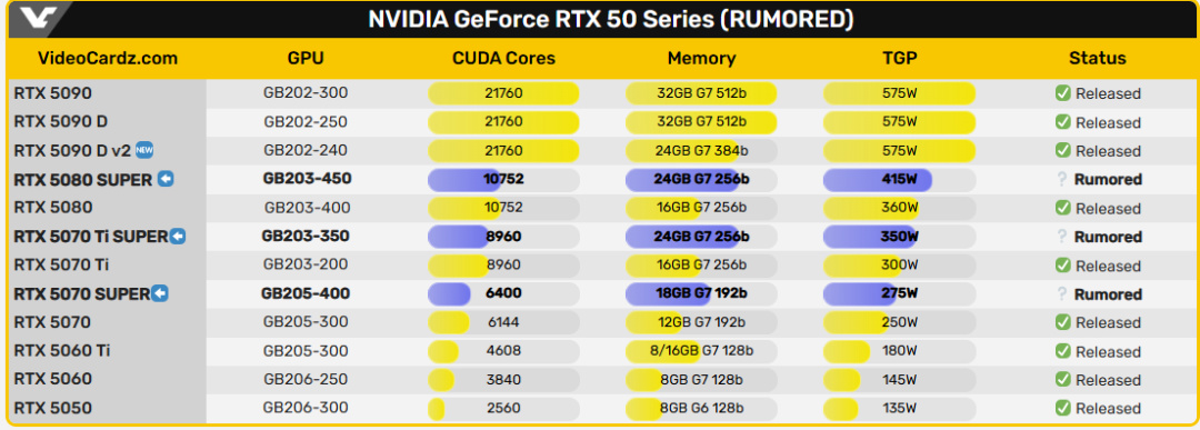RTX 5070Ti SUPER則僅提升了顯存容量,核心規模不變保持爲8960CUDA。兩款SUPER產品的功率分別從250W和300W增加到275W和350W。