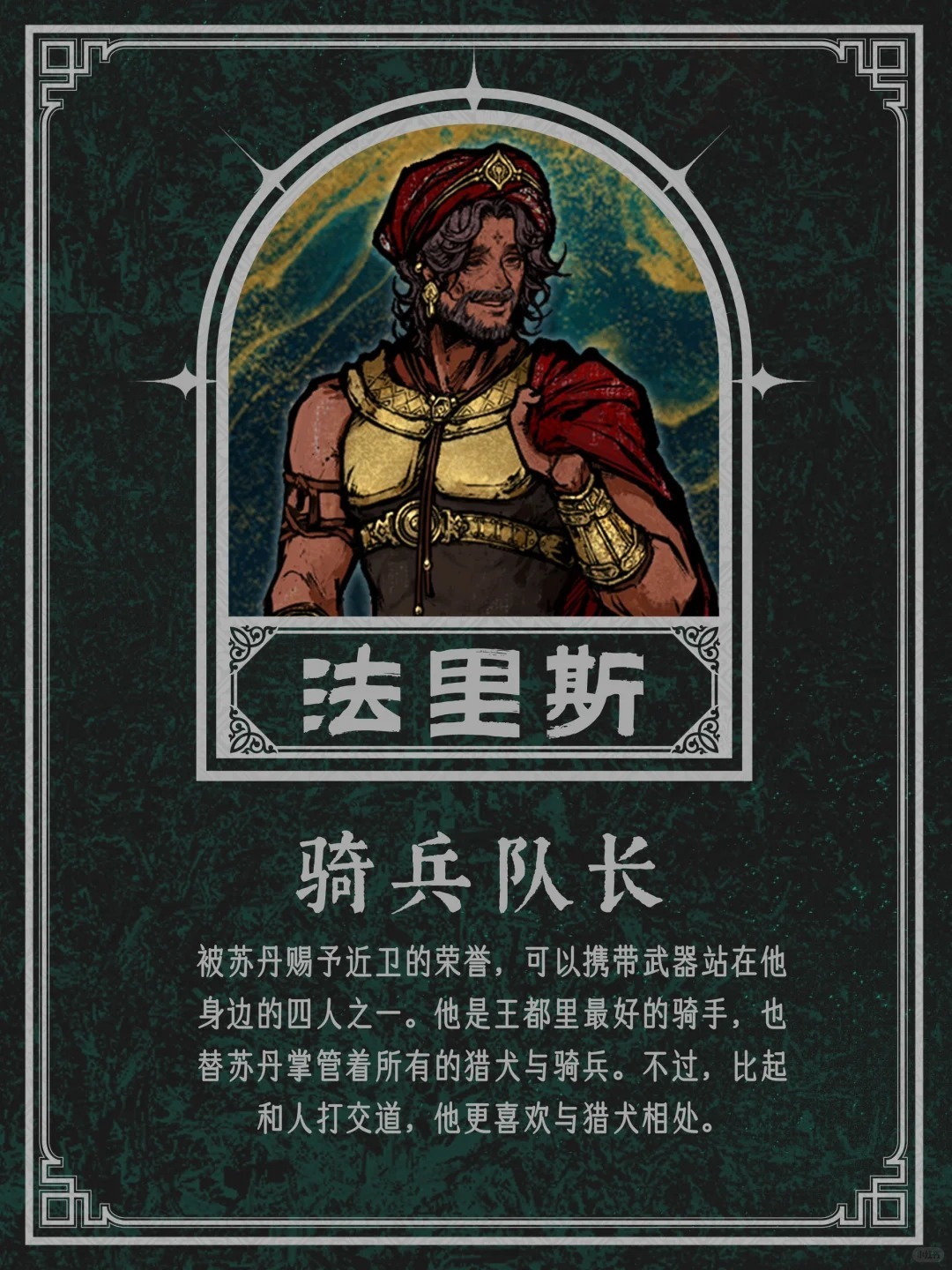 法里斯在月牙受害之后,请求主角帮忙查明真相,在得知是苏丹害死了月牙之后,却依旧没有撕掉近卫标,而是在得到法德耶给的小狗新月之后,才撕掉了标,决定跟随主角一起反抗苏丹。